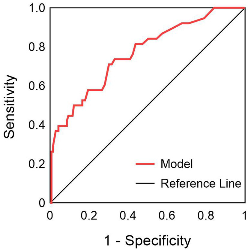 Based on the results of multivariate logistic regression analysis, a nomogram model was constructed to predict the risk of pulmonary infections in severe myelitis (Figure 4). The C-index was 0.766 (95% CI, 0.678–0.854). The ROC curve analysis (Figure 5) showed an area under the curve (AUC) of 0.766 (95% CI, 0.678–0.853, p < 0.001), with a sensitivity of 71% and specificity of 70%. These results suggest that NPAR and high cervical cord lesions has a good predictive performance for the occurrence of pulmonary infections in patients with severe myelitis.