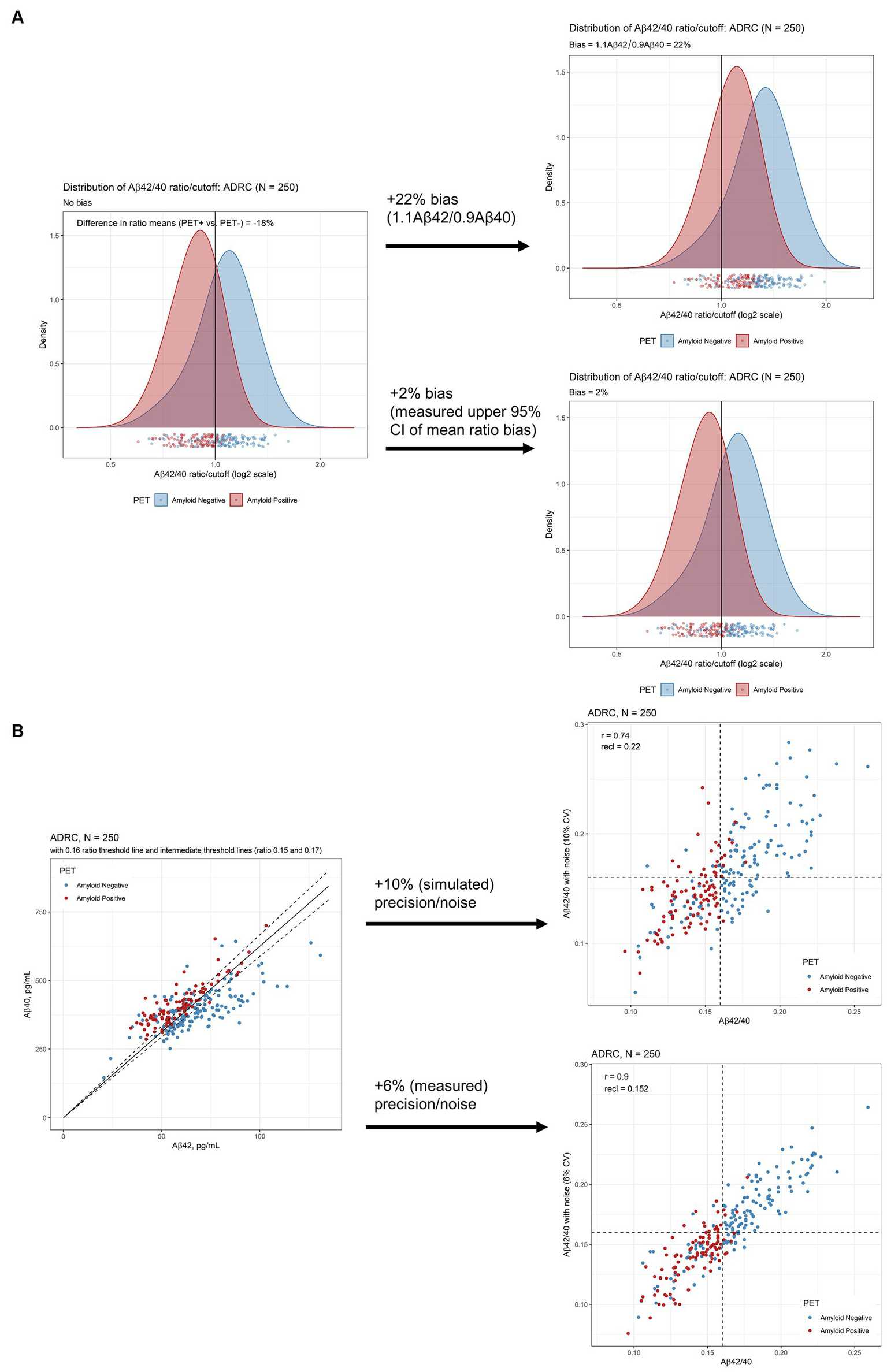 To estimate the effects of potential bias in the measure of Aβ42 and Aβ40 on the performance characteristics of the Aβ42/40 ratio, per Rabe et al. (13), we evaluated a 10% increase in Aβ42 response and a 10% decrease in the Aβ40 response for a total Aβ42/40 bias of 22% (1.1/0.9 = 1.22). The measured bias was similarly assessed. Performance characteristics were calculated for both the observed Aβ42/40 ratio and the biased Aβ42/40 ratio. Joint 95% CI were obtained for sensitivity/specificity and PPV/NPV on classification of PET status (28). All CI for performance characteristics were obtained by non-parametric bootstrap. All analyses were conducted using R (version 4.2.1).