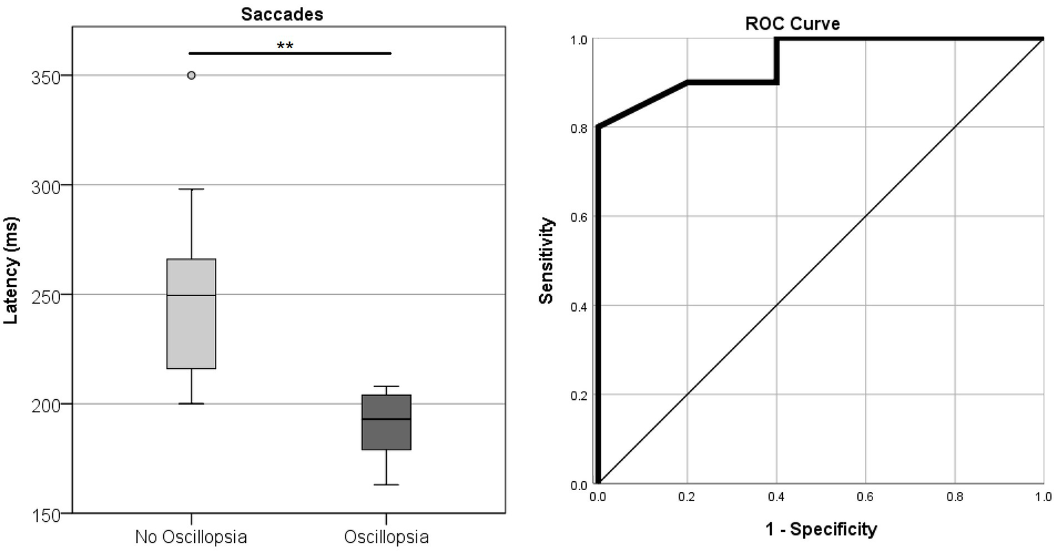 Latency of horizontal saccades in the BVL group without and with oscillopsia together with the ROC curve plot.