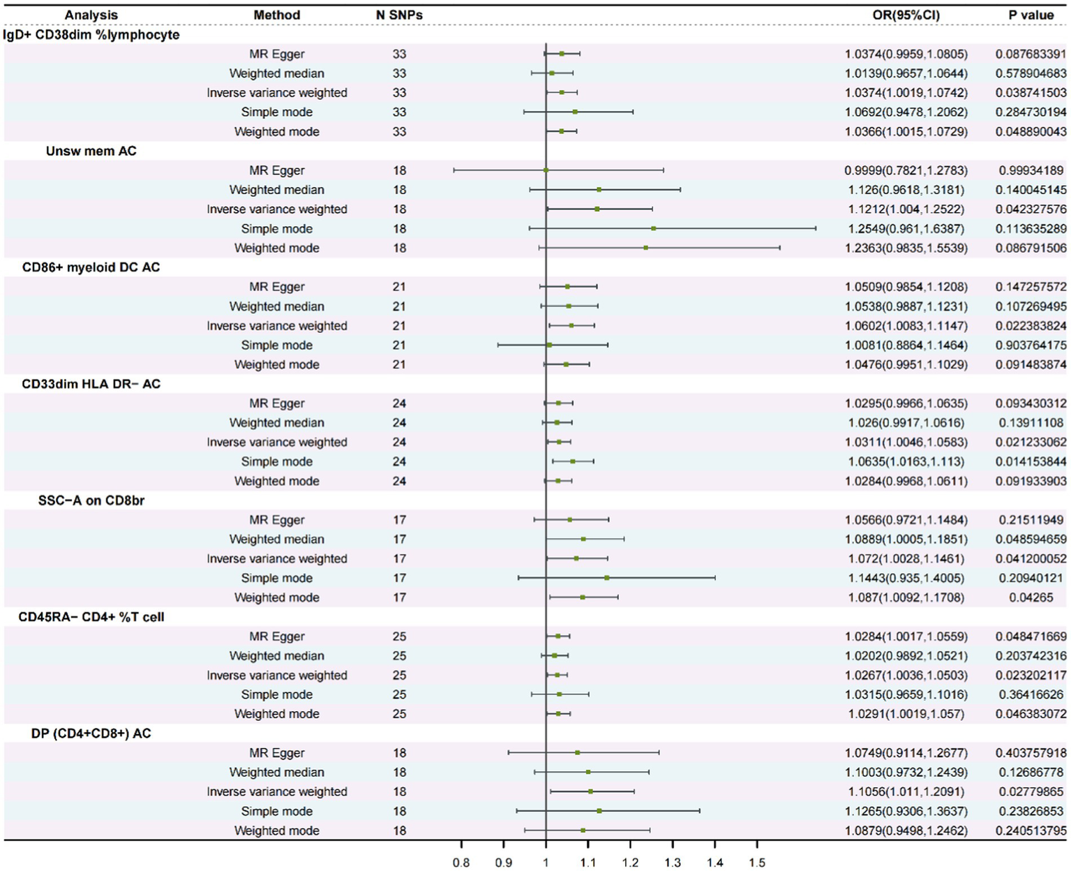 To find a possible link between susceptibility and 731 immune-mediated immunophenotypes, we conducted a bidirectional MR investigation in the present study. We identified seven immune phenotypes associated with SSHL using mainly the IVW method and using FDR correction (FDR < 0.05) as a criterion for correlation (Supplementary file 2: Table S1). Subsequently, we assessed the stability of the results by sensitivity analyses, which revealed that seven immunophenotypes were associated with SSHL (Figure 2; Supplementary file 2: Table S2). The screening program identified two panel for B cells (IgD+ CD38dim % lymphocyte and Unsw mem AC), one panel for conventional Dendritic Cells (cDCs) identified as CD86+ myeloid DC AC, one panel for myeloid cells (CD33dim HLA DR− AC), two panels for detecting TBNKs (T cells, B cells, and NK cells) which included SSC-A on CD8br and DP (CD4+CD8+) AC, and one panel is for the maturation stage of T cells (CD45RA− CD4+ %T cells). Utilizing the IVW method, we obtained an odds ratio (OR) for SSHL risk of 1.0374 (95% CI: 1.0019–1.0742, p = 3.87 × 10−2, FDR = 1.15 × 10−2) for IgD+ CD38dim % lymphocyte. Weighted mode and weighted median methods were also employed, resulting in odds ratios of 1.0366 (95% CI: 1.0015–1.0729, p = 4.89 × 10−2) and 1.0139 (95% CI: 0.9657–1.0644, p = 5.79 × 10−1). By the IVW method, we obtained an outcome Unsw mem AC odds ratio (OR) for SSHL risk of 1.1212 (95% CI: 1.004–1.2522, p = 4.23 × 10−2, FDR = 2.25 × 10−2). And it was obtained by weighted mode method (OR = 1.2363, 95% CI: 0.9835–1.5539, p = 8.68 × 10−2) and weighted median method (OR = 1.126, 95% CI: 0.9618–1.3181, p = 1.40 × 10−1). By the IVW method, we obtained an outcome CD86+ myeloid DC AC odds ratio (OR) for SSHL risk of 1.0602 (95% CI: 1.0083–1.1147, p = 2.24 × 10−2, FDR = 4.27 × 10−2). And it was obtained by weighted mode method (OR = 1.0476, 95% CI: 0.995–1.1029, p = 9.15 × 10−2) and weighted median method (OR = 1.0538, 95% CI: 0.9887–1.1231, p = 1.07 × 10−1). By the IVW method, we obtained an outcome CD33dim HLA DR− AC odds ratio (OR) for SSHL risk of 1.0311 (95% CI: 1.0046–1.0583, p = 2.12 × 10−2, FDR =4.69 × 10−2). And it was obtained by weighted mode method (OR = 1.0284, 95% CI: 0.9968–1.0611, p = 9.19 × 10−2) and weighted median method (OR = 1.026, 95% CI: 0.9917–1.0616, p = 1.39 × 10−1). By the IVW method, we obtained an outcome SSC-A on CD8br odds ratio (OR) for SSHL risk of 1.072 (95% CI: 1.0028–1.1461, p = 4.12 × 10−2, FDR =4.71 × 10−2). And it was obtained by weighted mode method (OR = 1.087, 95% CI: 1.0092–1.1708, p = 4.27 × 10−2) and weighted median method (OR = 1.0889, 95% CI: 1.0005–1.1851, p = 4.86 × 10−2). By the IVW method, we obtained an outcome CD45RA− CD4+ %T cell odds ratio (OR) for SSHL risk of 1.0267 (95% CI: 1.0036–1.0503, p = 2.32 × 10−2, FDR =4.82 × 10−2). And it was obtained by weighted mode method (OR = 1.0291, 95% CI: 1.0019–1.057, p = 4.64 × 10−2) and weighted median method (OR = 1.0202, 95% CI: 0.9892–1.0521, p = 2.04 × 10−1). Finally, by the IVW method, we obtained an outcome DP (CD4+CD8+) AC odds ratio (OR) for SSHL risk of 1.1056 (95% CI: 1.011–1.2091, p = 2.78 × 10−2, FDR =4.97 × 10−2). And it was obtained by weighted mode method (OR = 1.0879, 95% CI: 0.9498–1.2462, p = 2.41 × 10−1) and weighted median method (OR = 1.1003, 95% CI: 0.9732–1.2439, p = 1.27 × 10−1).