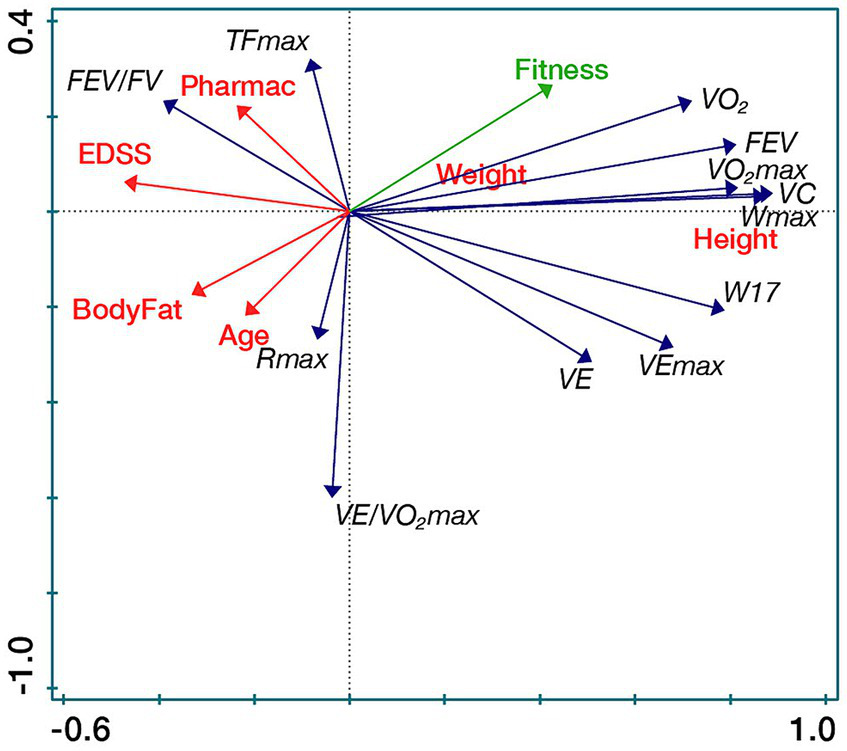 Spirometric and spiroergometric parameters in relation to participants’ characteristics (RDA biplot). VO2max/kg [mL/kg/min], Maximal oxygen uptake; VEmax/kg [L/min.kg], Maximal pulmonary ventilation; DHEA [nmol/L], Dehydroepiandrosterone; 7β-OH-DHEA [nmol/L], 7β-Hydroxy-dehydroepiandrosterone; FSMC, Fatigue scale for motor and cognitive functions; and SWLS, Satisfaction with life scale.