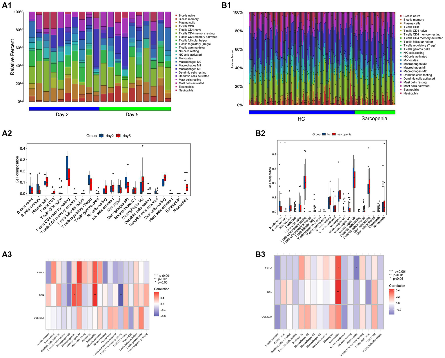 The results of the CIBERSORT algorithm revealed the immune cell infiltration landscape in both the SCI and sarcopenia after comparing the different groups. In the GSE21497 dataset, we assessed the proportion of immune cells and landscape (Figures 5A1,A2). FSTL1 had a significant correlation with M2 macrophages and neutrophils; DCN had a significant correlation with M1 macrophages, neutrophils, and CD4+ T cells (Figure 5A3). In the merged dataset (Figures 5B1,B2), FSTL1 had a significant correlation with neutrophils and plasma cells; DCN had a significant correlation with neutrophils (Figure 5B3).