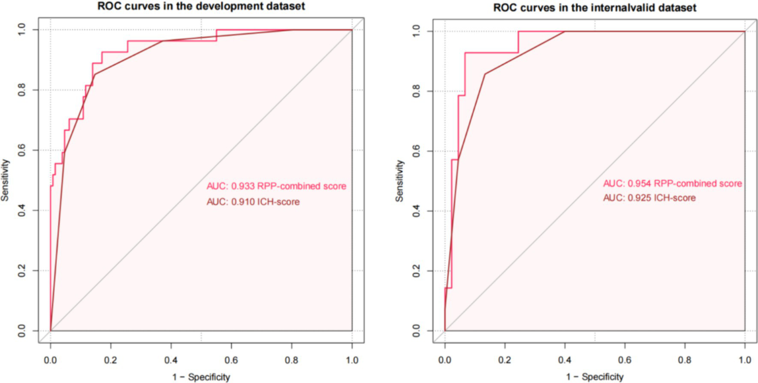 A total of 428 patients were included in our research. The final model included 4 independent predictors (Glasgow Coma Scale, hematoma volume, rate-pressure product, c-reactive protein) and was developed as a simple-to-use nomogram. The training set and internal validation set model’s C-index are 0.933 and 0.954, demonstrating moderate predictive ability with regard to risks of mortality. Compared to ICH score (AUC: 0.910 and 0.925), the net reclassification index (NRI) is 0.298 (CI = −0.105 to 0.701, p: 0.147) and integrated discrimination improvement (IDI) is 0.089 (CI = −0.049 to 0.228, p: 0.209). Our model is equally excellent as the classic ICH score model.