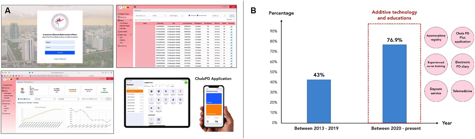 (A) Depicts a series of figures illustrating both the apomorphine registry platform on the website and the in-house ChulaPD Plus application available on mobile phones and tablets. This platform serves the purpose of recording data from patients undergoing apomorphine treatment in hourly increments of dosage. Additionally, it can represent outcomes or improvements in a graph for easy follow-up or understanding. (B) Among patients initiated on CSAI at our center between 2013 and 2019, 42% of those who started and continued treatment for over 12 months were found to have done so. Interestingly, following the implementation of educational programs and technology integration for patient progress tracking, a notable increase in the proportion of patients was observed, with 76.9% of patients who started the CSAI treatment since 2020 continuing treatment over 12 months. Additionally, additive technology and educations have been conducted mainly since 2020, including web-based apomorphine registry, ChulaPD Plus application, electronic PD diary, daycare service, telemedicine, and experienced nurse training.