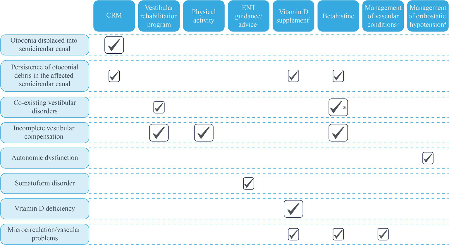 Benign paroxysmal positional vertigo, recurrent BPPV, and RD are entities often encountered in clinical practice, especially in the elderly in whom RD may contribute to an increased risk of falls, restrictions in activity, and social and economic burdens (114). It is beyond doubt that CRMs are often successful for eliminating positional vertigo (and are currently the first choice in managing BPPV), but there are many underlying pathologies that not only cause BPPV but also relate to BPPV recurrences and the risk of RD after a successful CRM. A greater understanding of the pathophysiology may help clinicians to develop a BPPV treatment plan and identify the most appropriate therapeutic option for each patient (115, 116). Table 2 summarizes the potential treatment approaches to the management of RD, based on the underlying pathophysiologies described earlier. There is robust evidence for the use of vestibular rehabilitation exercises (1, 61, 62) in optimizing vestibular function, and some evidence for the effect of betahistine on vestibular function (73, 77, 81, 120), and both betahistine (51, 121) and vitamin D supplementation (55, 93) on factors affecting otolith structure and function and inner ear circulation. Table 2 highlights specific patient populations that are at higher risk of RD and should therefore be monitored closely. However, the ability to identify objective markers/measures of RD is essential to accurately and definitively demonstrate clinical benefits of any potential treatment.