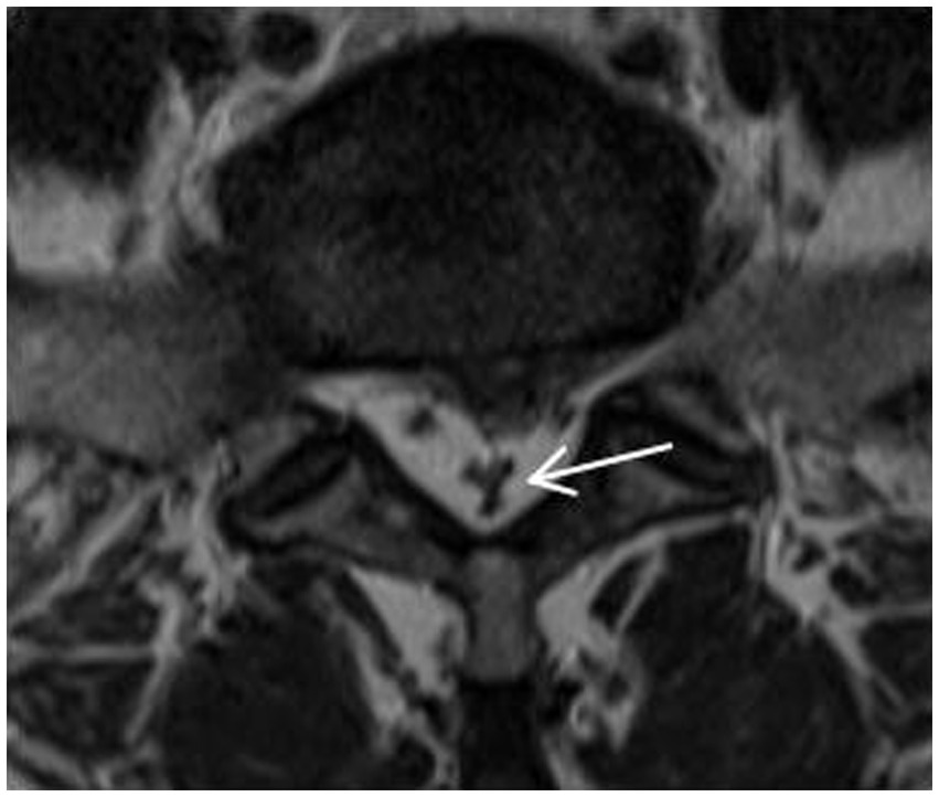 Categories 0–3, as shown in Figure 4, and according to whether the dural sac was deformed by compression or not, it was divided into Group A without deformation by compression (category 0 + 1) and Group B with deformation by compression (category 2 + 3). When a segment showed the “Y” sign, it was identified as category 3 in the cross-sectional classification in this study. Kuhn et al. (20) found that when epidural fat was severely accumulated in the spinal canal, it compressed the dural sac into a Y-shape and named it the “Y” sign, as shown in Figure 5.