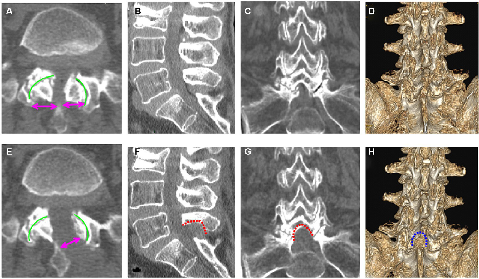 Pre- (A–D) and postoperative (E–H) computed tomography (CT) images of the lumbar spine (a 69-year-old woman). (A) Preoperative axial CT image of L5/S1; (B) preoperative sagittal CT image of L5/S1; (C) preoperative coronal CT image of L5/S1; (D) preoperative three-dimensional CT image of L5/S1; (E) postoperative axial CT image of L5/S1; (F) postoperative sagittal CT image of L5/S1; (G) postoperative coronal CT image of L5/S1; (H) three-dimensional CT image of L5/S1.