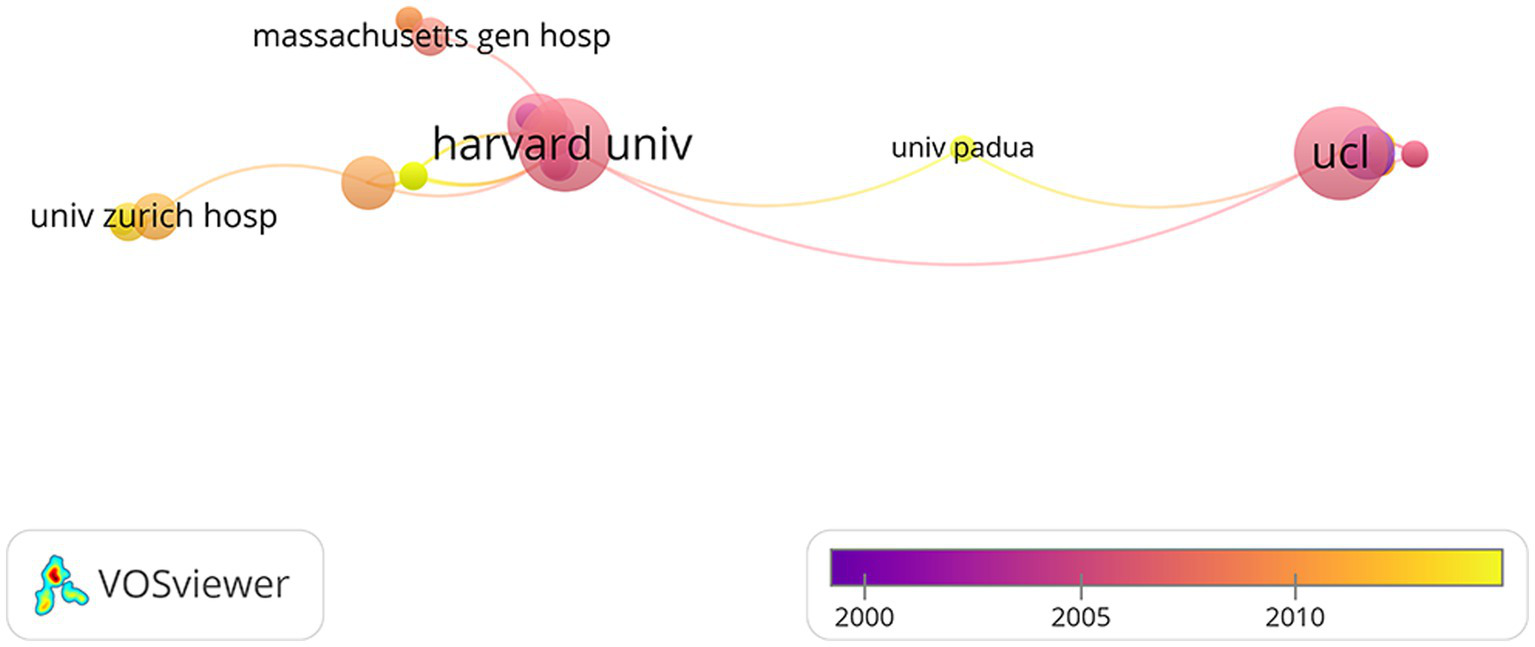 In addition, we analyzed the top 10 institutions that published these 100 articles which is shown in Table 3. The top 10 organizations are mainly from the United States. Harvard University is the top 1 with 22 articles. Followed by National Food Research Center Japan, Stanford University, University Copenhagen, University Tubingen and Washington University tied for second place with 9 articles. The Collaboration Network between the institutions is shown in Figure 5. The university that works most closely with other colleges and universities is Harvard University. Among the institutions that collaborate with Harvard University, University College London publish the higher number of articles. In general, there is close cooperation between University Hospital Zurich, Harvard University, University College London, University of Padua and Massachusetts General Hospital.