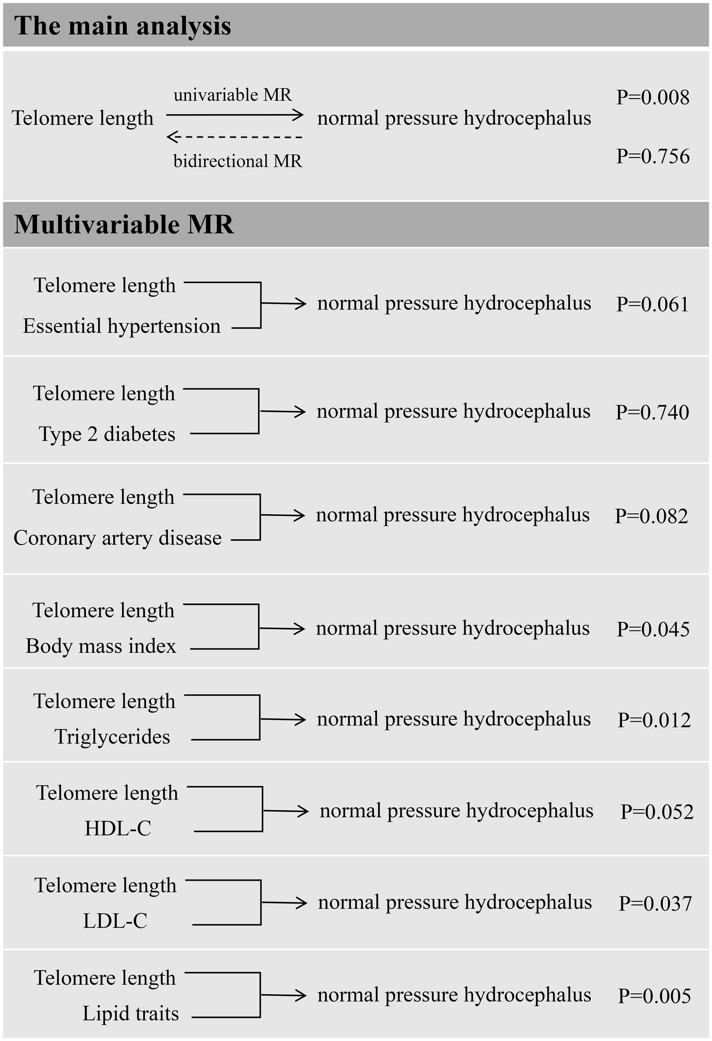 In conclusion, our MR study supports the causal effect of telomere shortening on risk of iNPH. In addition, essential hypertension, T2DM and CAD might act in the telomere length-iNPH pathway, while there was no enough evidence for other vascular risk factors in the causality. These findings help us better understand the pathophysiology of iNPH and highlight the role of vascular risk factors underlying the causal association. More research is needed to confirm the findings and to explain the cellular and molecular mechanisms behind them.