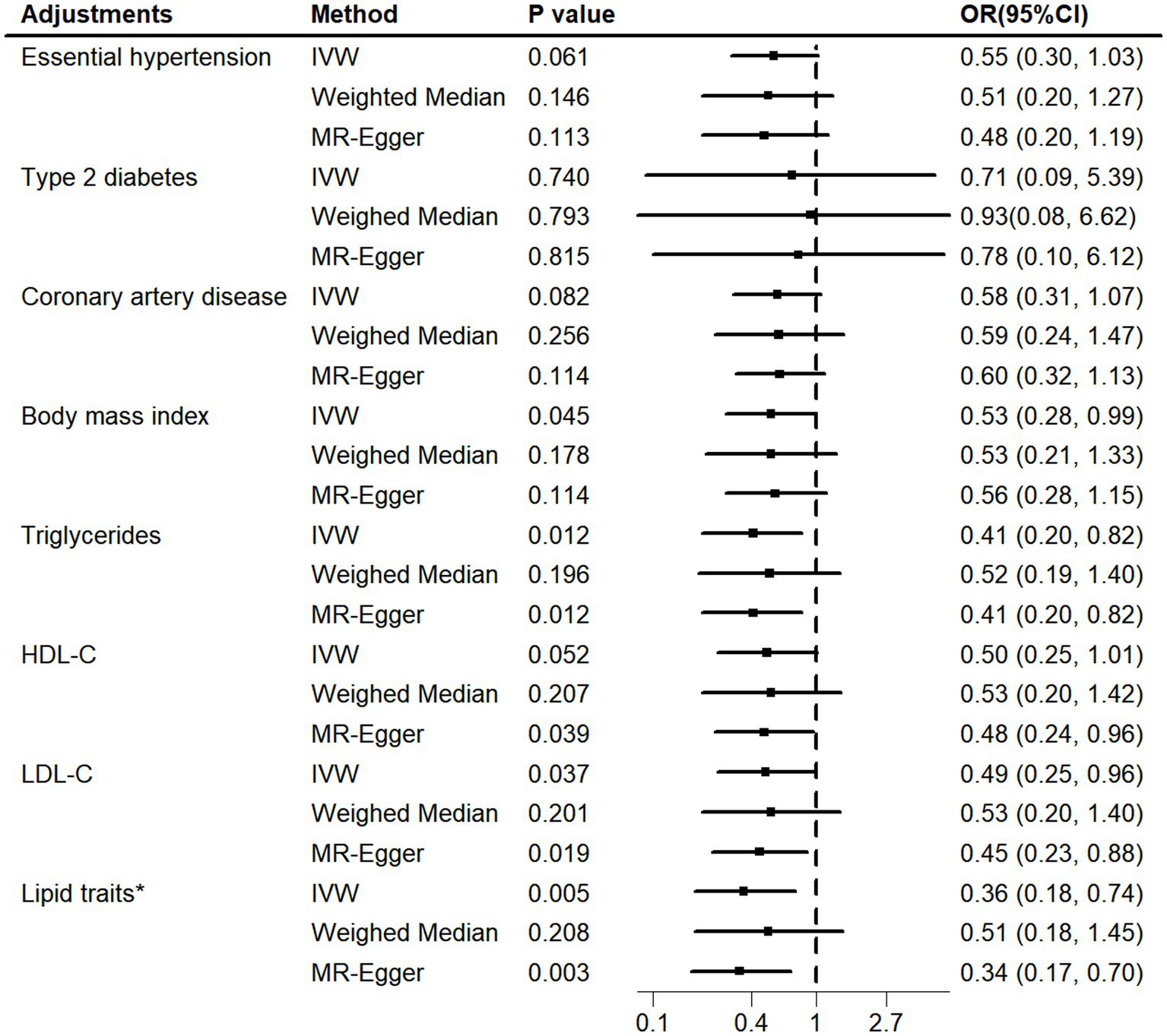 MVMR adjusted for vascular risk factors. MVMR, multivariable Mendelian randomization; HDL-C, high-density lipoprotein cholesterol. LDL-C, low-density lipoprotein cholesterol. Lipid traits* included triglycerides, HDL-C and LDL-C.
