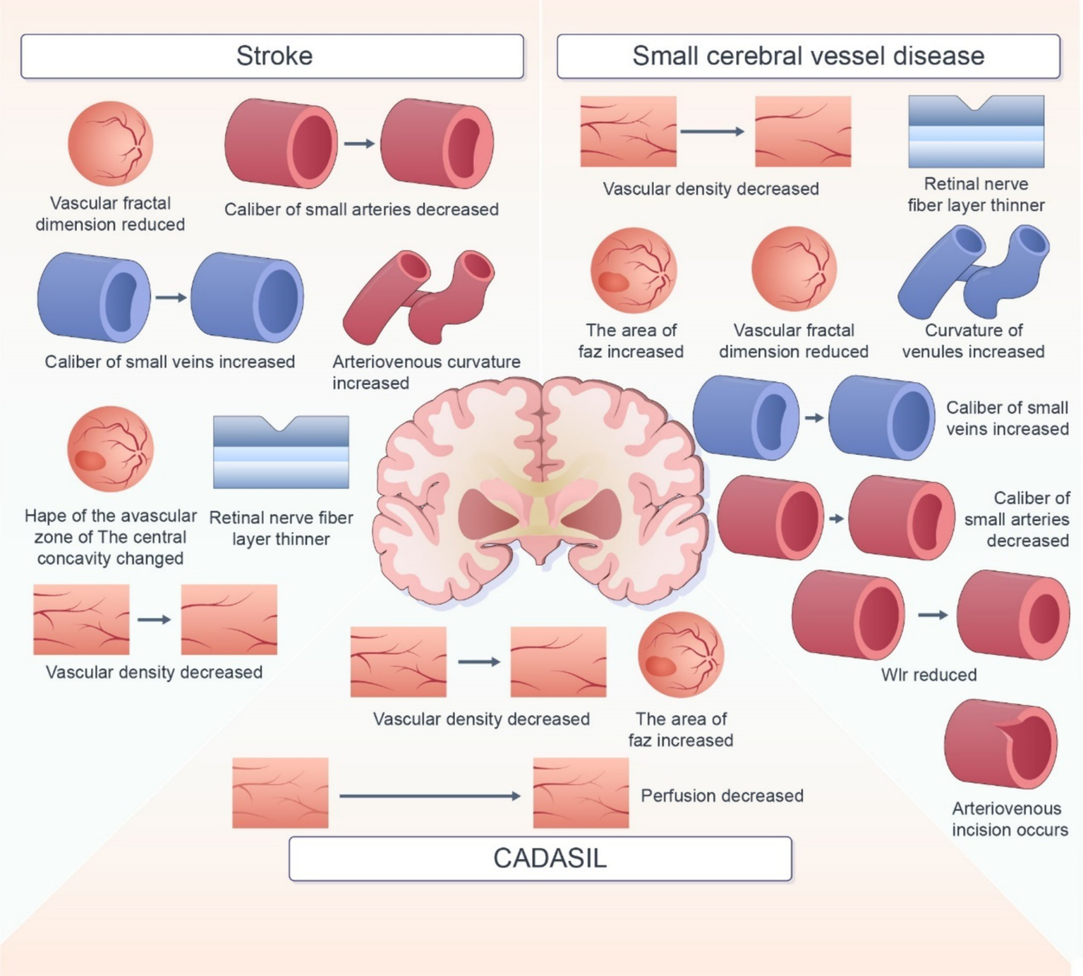 Cerebral autosomal dominant arteriopathy with subcortical infarcts and leukoencephalopathy (CADASIL) is an inherited cerebral small-vessel disease caused by mutations in the NOTCH3 gene on chromosome 19 (66). Fang et al. detected fundus lesions in patients with CADASIL and reported that the outer diameter of retinal arteries was increased and arterial walls were thickened in CADASIL patients compared with healthy controls (5). A recent study by Lin et al. investigated vascular density in the macular region of the eyes of CADASIL patients (divided into stroke and non-stroke groups) and healthy controls. They found that compared with healthy subjects, stroke patients exhibited significantly lower VD in the superficial retinal plexus of the macula, and that VD and intraretinal thickness were positively correlated with gait speed and negatively correlated with the number of cavities in the brain, but there was no significant difference in VD between the total CADASIL group and the control group (86). These findings diverge from those of Nelis et al., who reported significantly reduced macular vascular density in CADASIL patients compared to healthy controls (32). This difference may be due to the inclusion of different subgroups and variations in the disease course. In the study, they subdivided patients into stroke versus non-stroke subgroups, whereas in the study by Nelis et al. this patient classification was not performed and the reduction in vascular density was a slower process that could serve as a marker of the severity of CADASIL in its later stages, but not an early manifestation. Moreover, both studies lacked a standardized disease severity assessment for CADASIL patients and included relatively small sample sizes. These limitations could contribute to the observed discrepancies in findings.