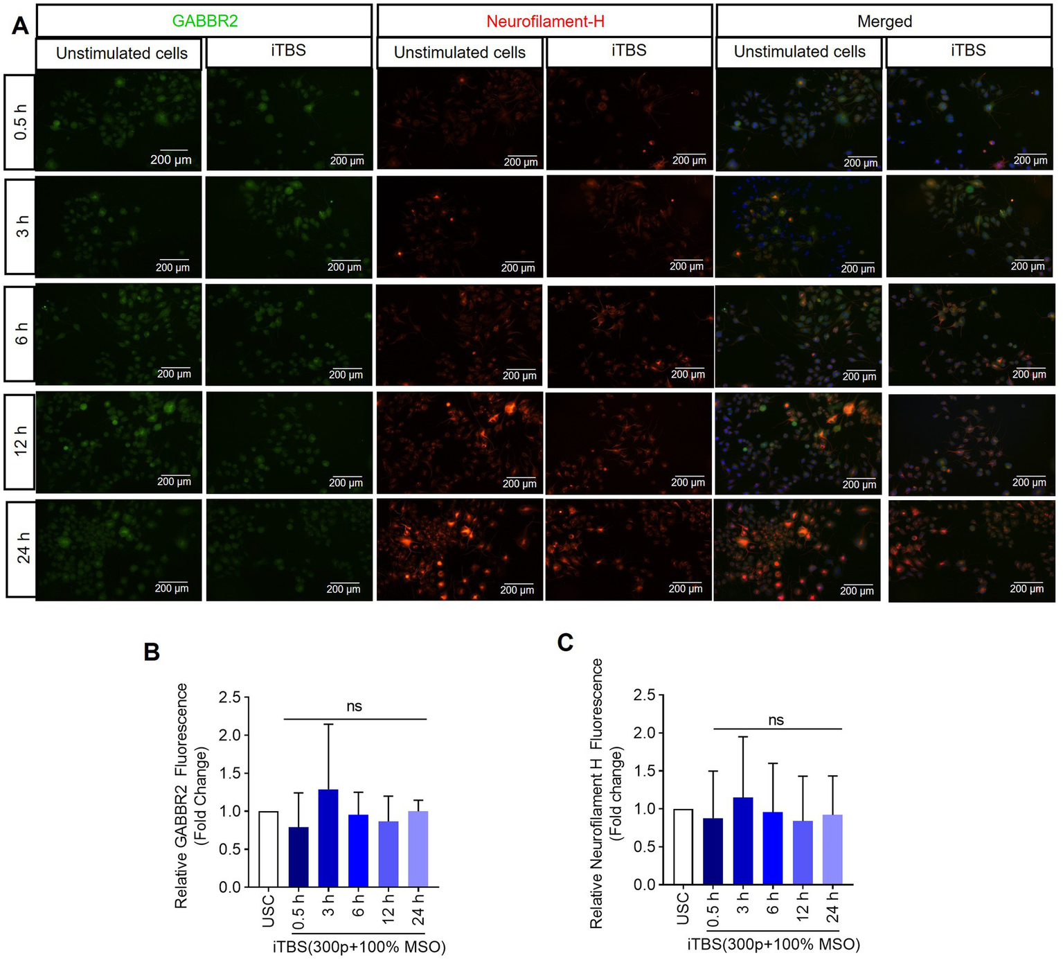 The expression of GABBR2 and Neurofilament-H over 24 h following a single dose of iTBS. (A) A representative image depicts the immunofluorescence staining for GABBR2 (green, Alexa Fluor 488) and Neurofilament-H (orange, Alexa Fluor 546) after 0.5, 3, 6, 12, and 24 h post-iTBS in RA-differentiated N2A cells (magnification 10×, scale bars: 200 μm). (B,C) Quantification of mean fluorescence intensity (MFI), presented as fold change are shown from three independent experiments (mean ± SD, n = 3). Statistical significances were calculated and compared with unstimulated cells (USC) of each respective time points by Kruskal–Wallis H test (ns, not significant compared with USC).