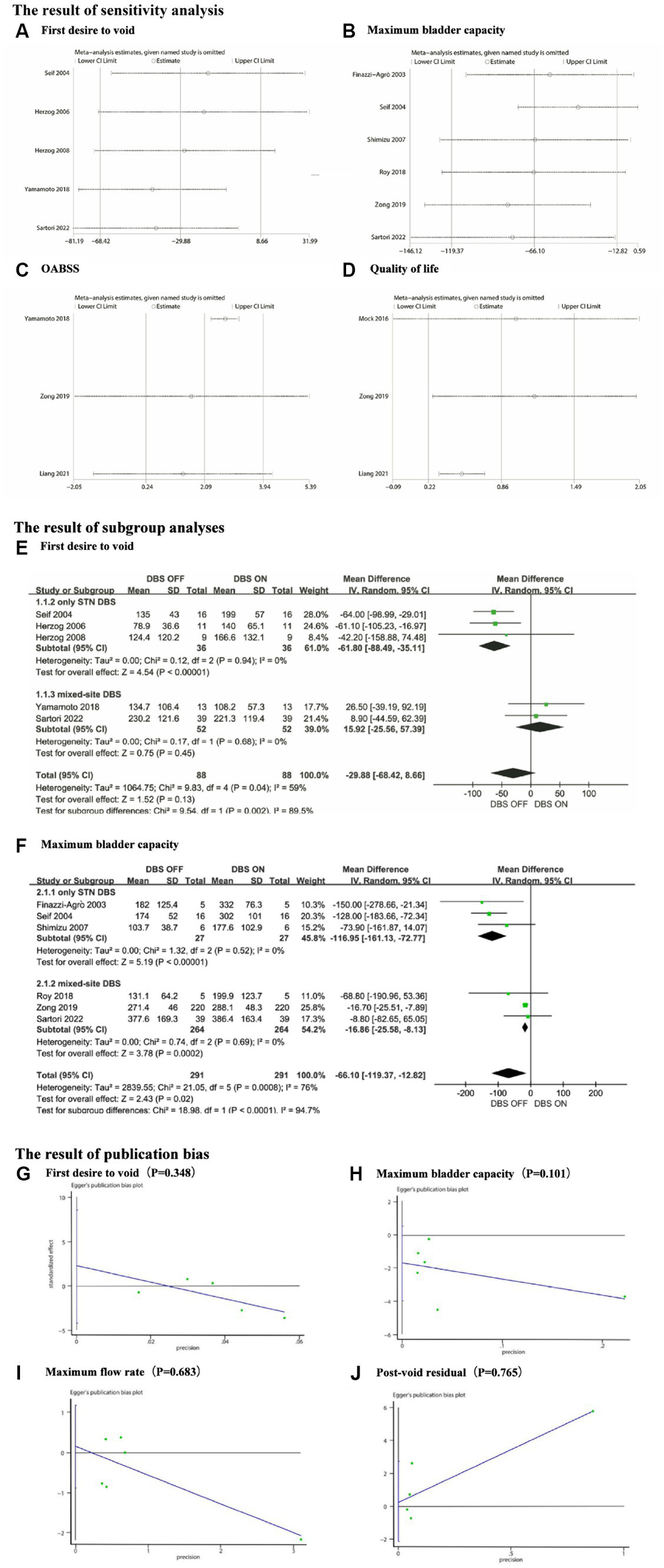 (A) Sensitivity analysis for First desire to void, (B) Sensitivity analysis for Maximum bladder capacity, (C) Sensitivity analysis for OABSS, (D) Sensitivity analysis for Quality of life, (E) The subgroup analyses for First desire to void, (F) The subgroup analyses for Maximum bladder capacity, (G) The publication bias for First desire to void, (H) The publication bias for Maximum bladder capacity, (I) The publication bias for Maximum flow rate and (J) The publication bias for Post-void residual.