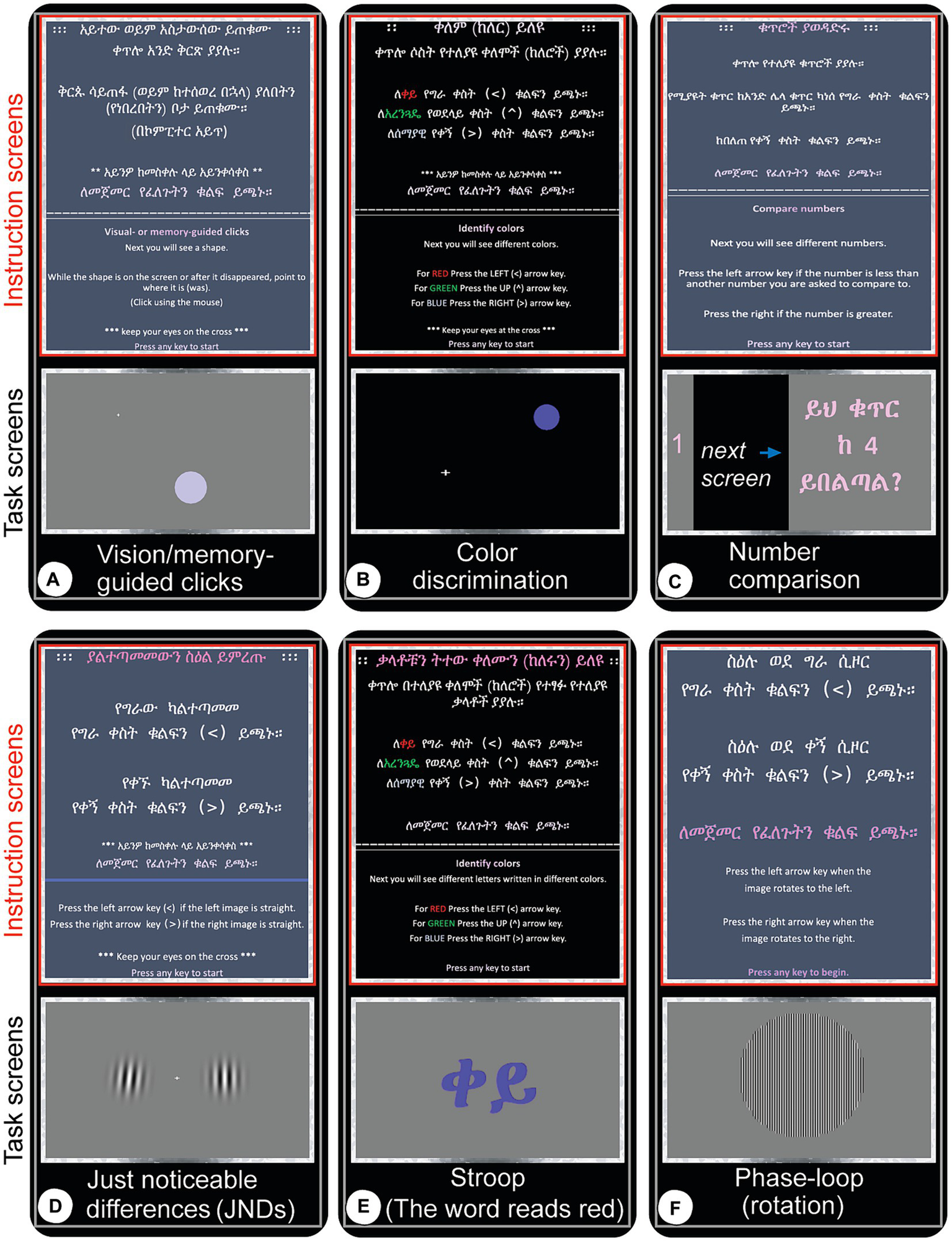 Screen captures (real-time snapshots) of computer test instructions and actual experiments as they are being administered. Once the participant expresses confidence in taking the test, the experiment is started with the first display being the written instructions (red-boxed, top panels in each test panel) followed by the actual experiment (gray-boxed, bottom panels). The subjects wait for a central target to appear and are instructed to keep their eyes focused there while using peripheral vision to perform the tasks and respond with a mouse movement and click or custom keyboard click. Experiments are self-terminated when all trials are completed. (A) Vision and memory-guided clicks: move the mouse to a target location where a circular stimulus appears randomly while it is still displayed (visual), or once it appears quickly and disappears (memory). (B) Color discrimination: red, green and blue circles appear left, above or right of fixation or at random location and order and the subject has to click the left, up or right arrow keys for red, green and blue colors, respectively. All subjects are tested for color-blindness to these colors and none of the subjects had difficulties separately identifying them. (C) Number comparison: click left arrow key if the number you just saw is smaller than the number that was quickly displayed a moment ago, or the right arrow key if it is greater. (D) Just-noticeable differences (JNDs): two circular images filled with nearly/vertical bars (Gabor patches) are displayed left and right of the central fixation point. Click the left or right arrow key if the left or right image is vertical, respectively. (E) Stroop test: this task measures the level of accuracy in dissociating color from information a given text displays. For instance, in this snapshot, the Ethiopian (Amharic) word displayed stands for ‘red’ but it is written in blue. The subject has to press the right arrow key which represents the color blue, not the left one which represents red color. (F) Phase-loop: press the left arrow key if the image seems to rotate left, or right arrow key if it is perceived to move to the right.