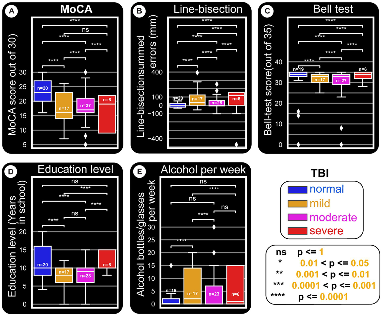 Paper tests and education level and their relationships with TBI types. This distribution figure uses box plots to compare quantitative data from different variables. Straight line segments above each pair of boxes connect significantly different as shown by p-values from Mann–Whitney-Wilcoxon two-sided test. The level of these differences are depicted by asterisks (‘*’) or ‘ns’ (not significant). As in other figures, all x-axes are set to the main categorization used: TBI kind (normal, mild, moderate and severe). The three quartile values of each distribution are shown by the boxes and the rest of the distribution is presented by the whiskers. These whiskers extend to observations that are within 1.5 interquartile-ranges of the lower and the upper quartile. The mid-point of the data (middle quartile, also called the median) is indicated the middle line in the boxplot that divides the two parts of the box. Outliers are shown by diamond points. (A) MoCA score is reduced with severity of TBI damages. (B) Line-bisection test scores. The boxplots are plotted against a y-axis which depicts the cumulative errors for all line crossings that are left (negative) or right (positive) of the ideal middle for each line. Accordingly, more positively skewed crossings indicate possible left neglect. It appears that patient groups tend to be right or left skewed, owing to the majority of the side of the brain damaged for the cohort. (C) Bell’s test score versus TBI damages does not seem to show major differences. However, as in Figures 8B,C, normal subjects seem to have a stable error distribution, while patients (especially moderate and severe TBI ones) show wider and skewed boxplots. (D) Education level also seem to be related to TBI damage, in that normal subjects tend to have higher education. Whether this points to a major predisposition to get into TBI situations remains to be seen. (E) The amount of alcohol consumed per week appears to be positively related to having TBI in general.