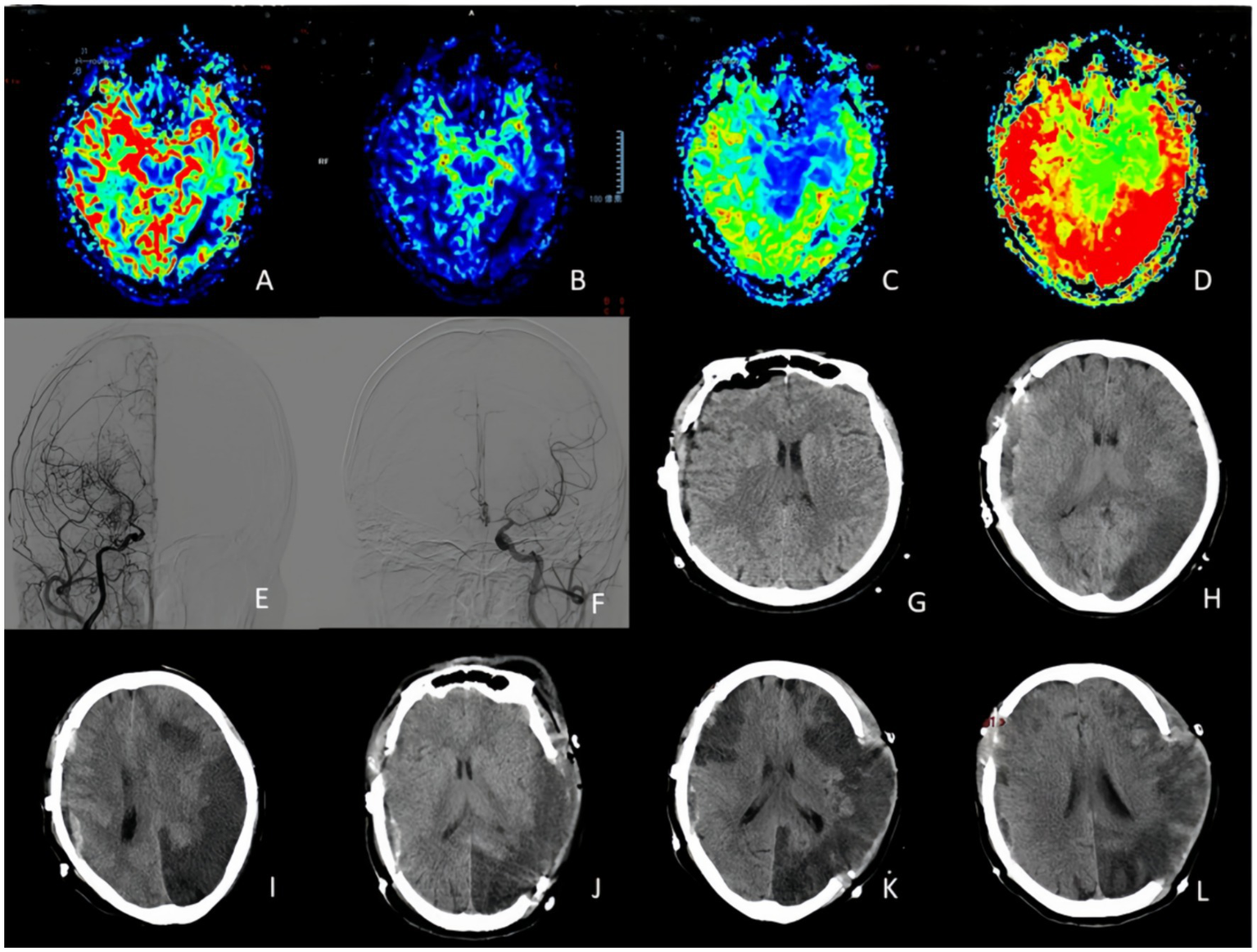 A 63-years-old woman who experienced right side lower extremity weakness one prior surgical treatment. (A,B) PWI indicated CBV decreased in the left temporal occipital lobe and right frontal and parietal lobe, and CBF decreased in the right cerebral hemisphere and left temporal and occipital lobe. (C,D) PWI showed MTT and TTP delayed in right cerebral hemisphere and left temporal occipito-parietal lobe. (E,F) DSA suggested occlusion of the right internal carotid artery with moyamoya vessels. Left middle cerebral artery and anterior cerebral artery stenosis. (G–I) CT changes on postoperative day, postoperative day 1, and postoperative day 3 indicated a severe cerebral infarction on the non-operative side (stenotic side). (J–L) On the third day, the patient underwent left side decompressive craniectomy, and CT findings were obtained at postoperative day 1, 3 and 10.