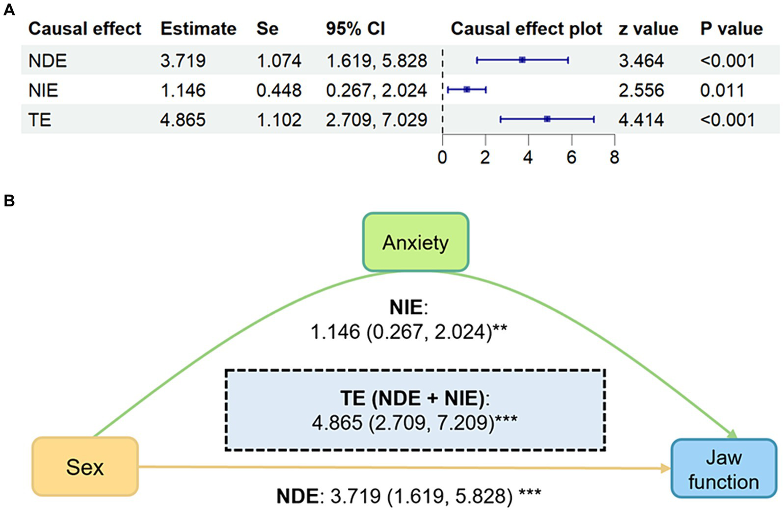 In TMD patients, there was a significant association between female and jaw function (r = 0.17, p < 0.001), female and anxiety (r = 0.15, p = 0.002), anxiety and jaw function (r = 0.35, p < 0.001). In addition, sex can directly lead to differences in impaired jaw function (NDE: 3.719, 95% CI: 1.619–5.828, p < 0.001), and can also be causally related to jaw function through anxiety (NIE: 1.146, 95% CI: 0.267–2.024, p = 0.011). And the total effect was 4.865 (95% CI, 2.709–7.029, p < 0.001).