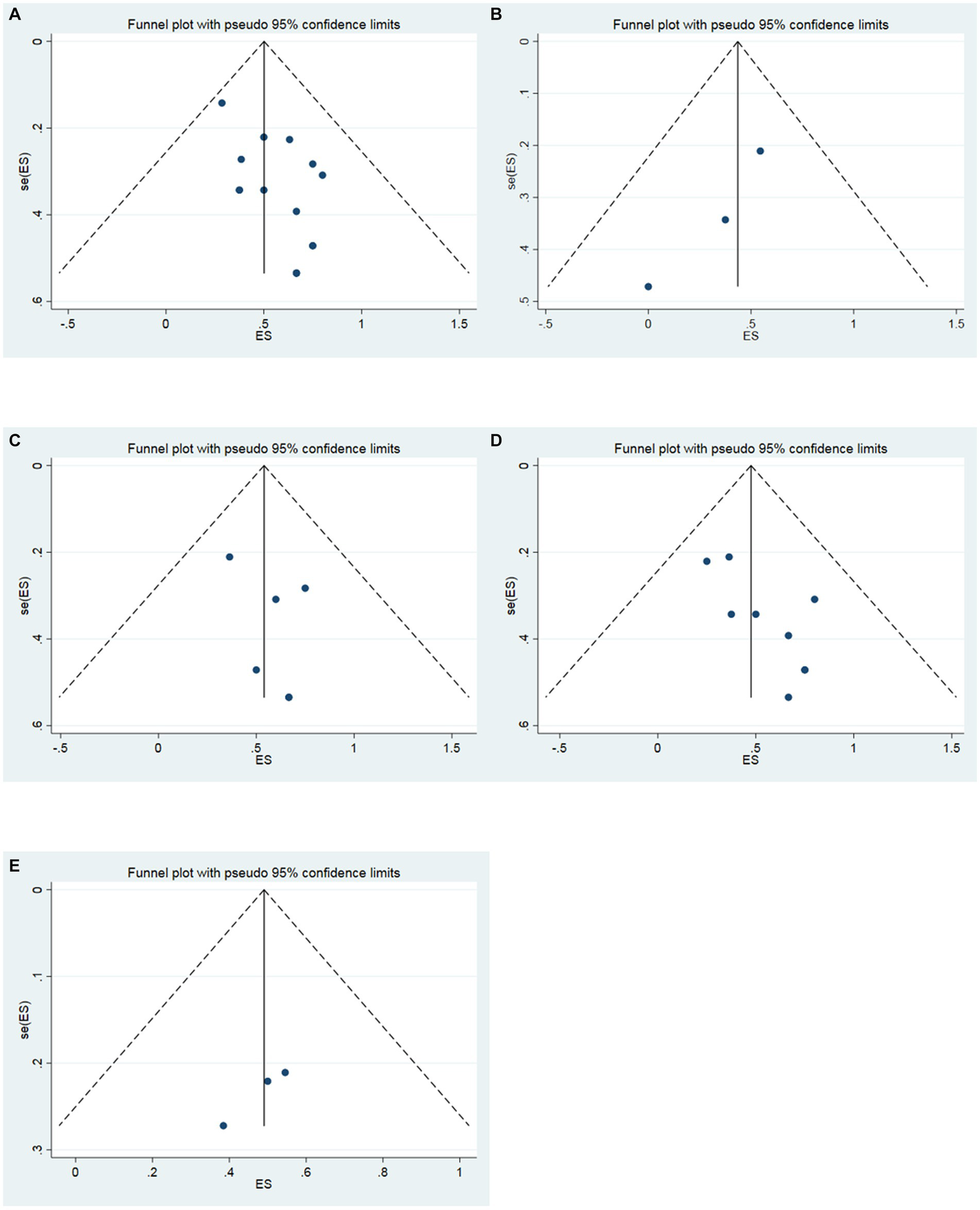 The funnel plot was drawn to detect the existence of publication bias in this study. The funnel plot of 16 studies was symmetric, which meant that there was no publication bias (Figure 4A). In addition, the funnel plots were also performed to respectively evaluate the publication bias in the studies of the follow-up time of 3, 6, and 12 months. In the follow-up time of 3 months, the funnel plot of 3 studies was symmetric (Figure 4B). In the follow-up time of 6 months, the funnel plot of 6 studies was symmetric (Figure 4C). In the follow-up time of 12 months, the funnel plot of 9 studies was symmetric (Figure 4D). In the follow-up time of 24 months, the funnel plot of 3 studies was symmetric (Figure 4E). Three symmetric funnel plots suggested that there was no publication bias in the studies in the follow-up time of 3, 6, 12 and 24 months.