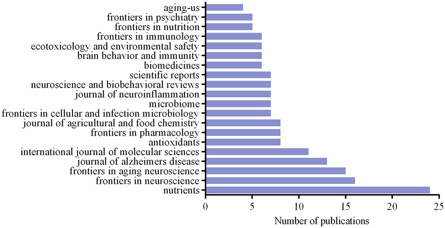 A total of 176 articles, or 38.4% of the total, were published by the top 20 journals in terms of publications. Figure 5 displays the total number of articles published in the top 20 journals. With 24 articles, Nutrients [impact factor (IF) = 5.9,2022, Q1] has the highest number of publications, followed by 16 related publications from Frontiers in Neuroscience. With 15, 13, and 11 articles published, Frontiers in Aging Neuroscience, Journal of Alzheimer’s Disease, and International Journal of Molecular Sciences were the top 3, 4, and 5 journals, respectively. Microbiome, with 7 publications, had the greatest IF of these 20 journals (IF = 15.5, 2022, Q1).