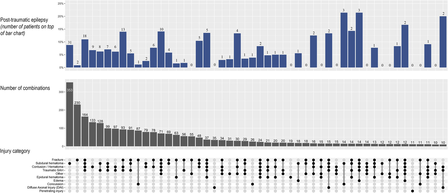 Patients with TBI admitted to hospital 2015–2018 were identified in the Norwegian Trauma Registry and matched to trauma-free controls on sex and birth year according to a matched cohort design. They were followed up for epilepsy in nationwide registers 2015–2020. Cumulative incidence of epilepsy in TBI patients and controls was estimated taking competing risks into account. Analyses stratified by the Abbreviated Injury Scale (AIS) severity score, Glasgow Coma Scale score and age were conducted for the TBI group. Occurrence of PTE in different injury types was visualized using UpSet plots.