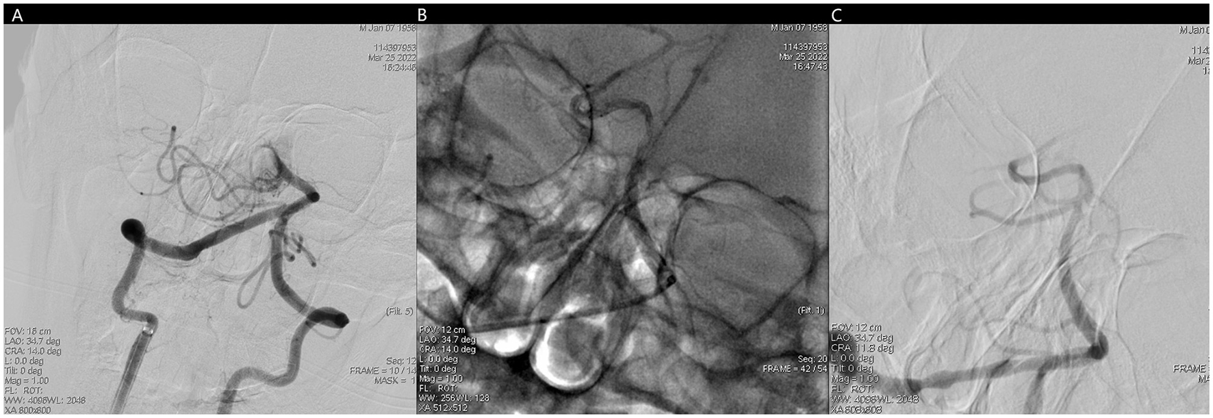 (A) No forward blood flow far from the middle of the basilar artery. (B) Fluoroscopic image of trevo stent after positioning and release. (C) Unobstructed basilar artery after mechanical thrombectomy.