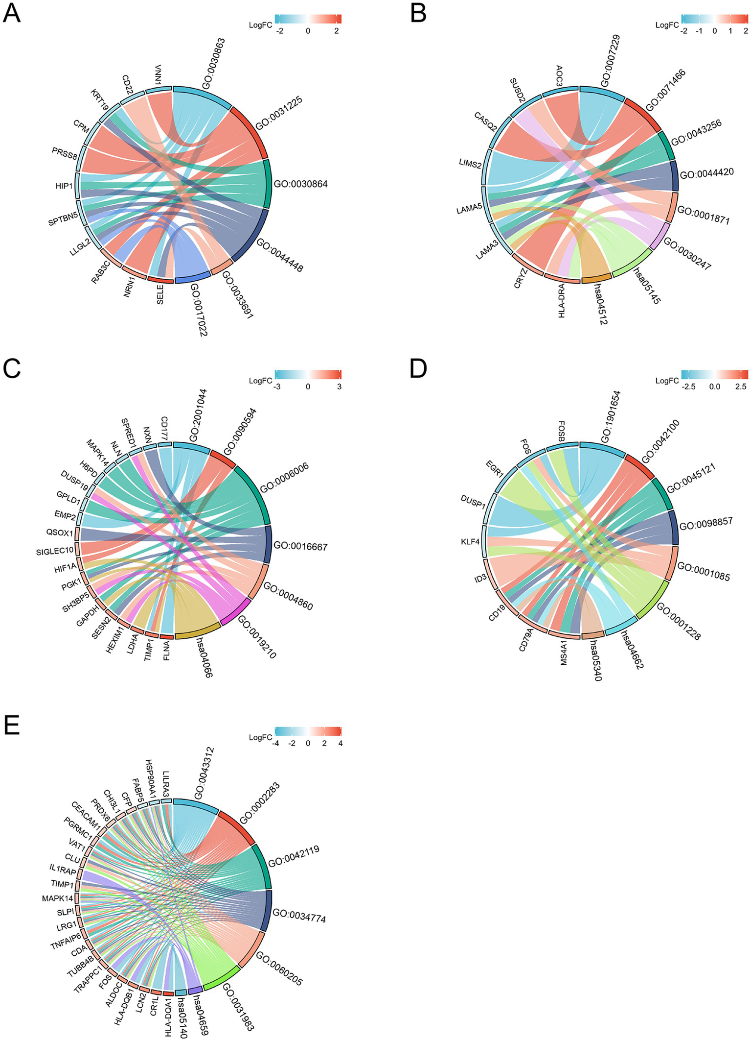 The chord diagram illustrates the relationship between differential genes and the significant enrichment pathway analysis results. (A) is COVID-AD, (B) is COVID-EP, (C) is COVID-HS, (D) is COVID-PD and (E) is COVID-SD (the width of the connecting line indicates the degree of relationship between the gene and CC, MF, BP or pathway).