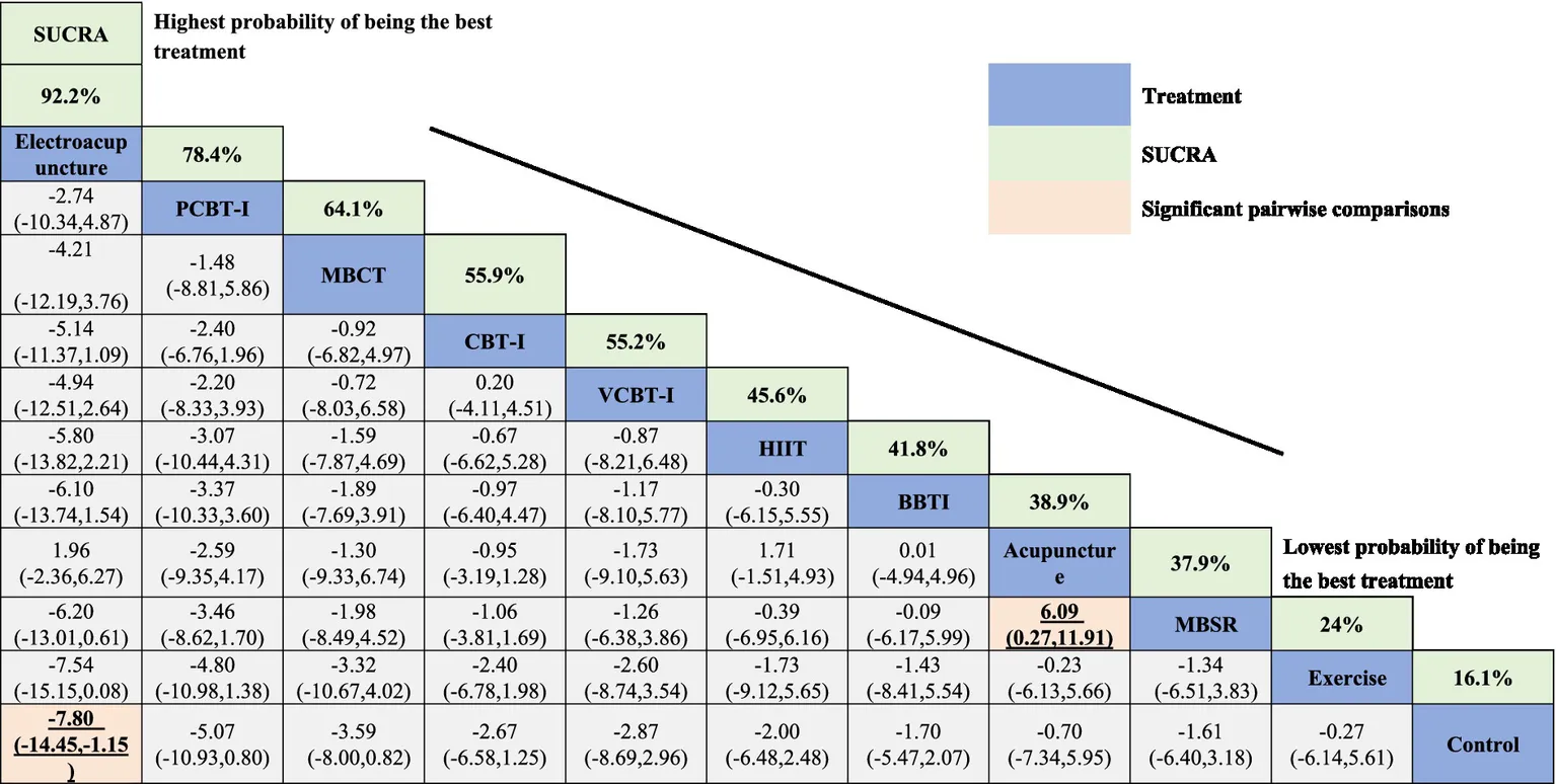 Our study included 41 randomized controlled trials, comprising 11 different non-pharmacological interventions (3,541 participants), the network analysis identifying Electroacupuncture as the most effective, with a SUCRA value of 92.2% in ISI, this was followed by Professionally administered Cognitive behavioral therapy for insomnia(PCBT-I) and Mindfulness-based cognitive therapy(MBCT), with SUCRA values of 78.4 and 64.1%, respectively. Traditional Cognitive behavioral therapy for insomnia(CBT-I) and VCBT-I showed lower efficacy with SUCRA values of 55.9 and 55.2%, respectively. Exercise interventions and control groups had the lowest efficacy, with SUCRA values of 24.0 and 16.1%. Using PSQI as the outcome measure, Massage therapy ranked highest in improving sleep quality with a SUCRA value of 92.2%, followed by Professionally administered Cognitive behavioral therapy for insomnia (PCBT-I) and Electroacupuncture. League tables indicated significant improvements in sleep outcomes for Electroacupuncture and MT compared to control groups, with Electroacupuncture (EA) showing an MD of −7.80 (95% CI: −14.45, −1.15) and MT an MD of −4.23 (CI: −8.00, −0.46).