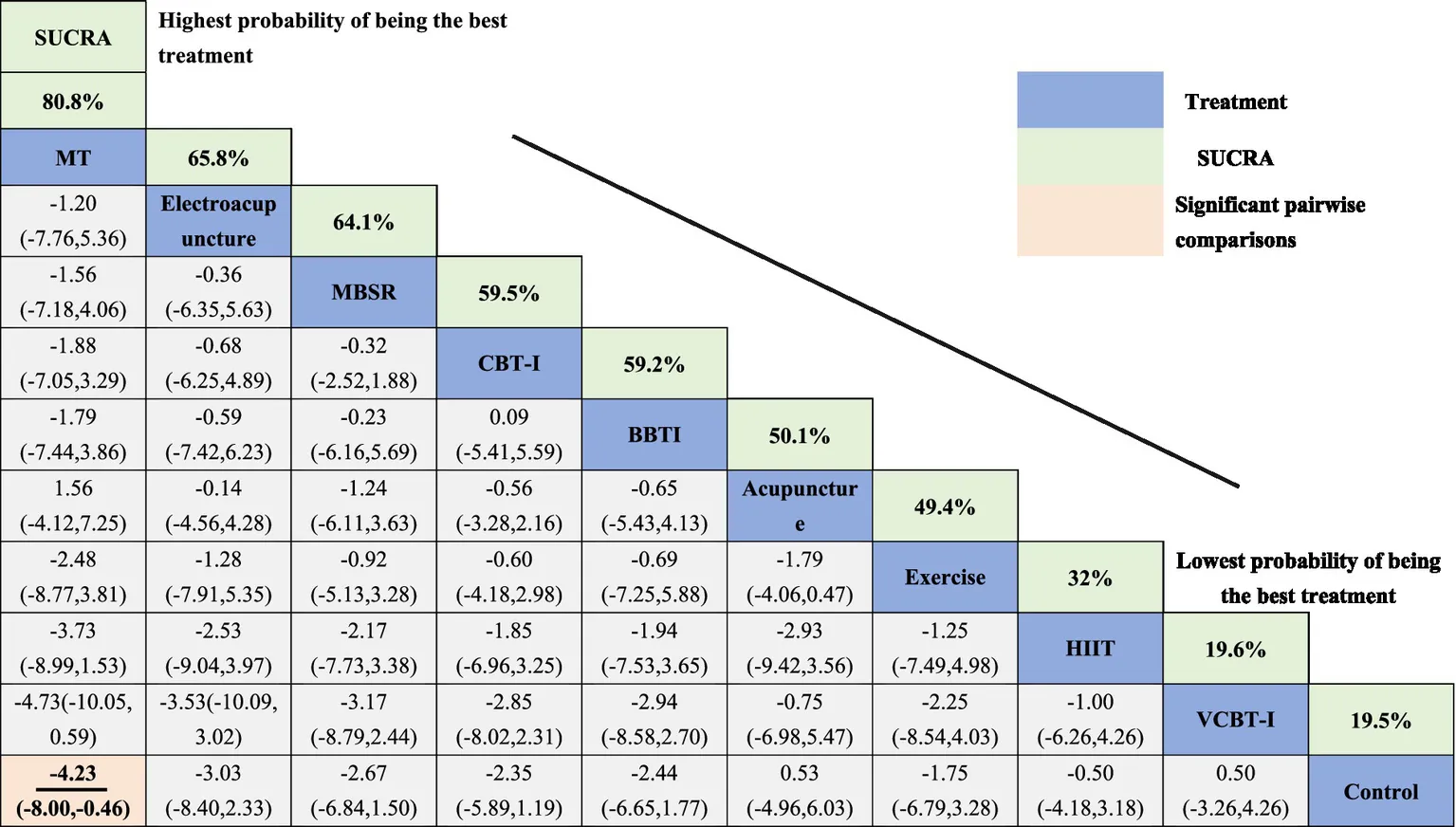 Direct and indirect analyses of the interventions, based on the league tables with ISI as the outcome measure, indicated statistically significant differences in comparisons between Electroacupuncture and Control, as well as between Acupuncture and MBSR. The potential impact indicators were represented with a 95% CI, with Electroacupuncture showing (MD = –7.80, CI: −14.45, −1.15), as seen in Table 2. In the league tables with PSQI as the outcome measure, the comparison between MT and Control was statistically significant, with MT (MD = -4.23, CI: −8.00, −0.46), as seen in Table 3.