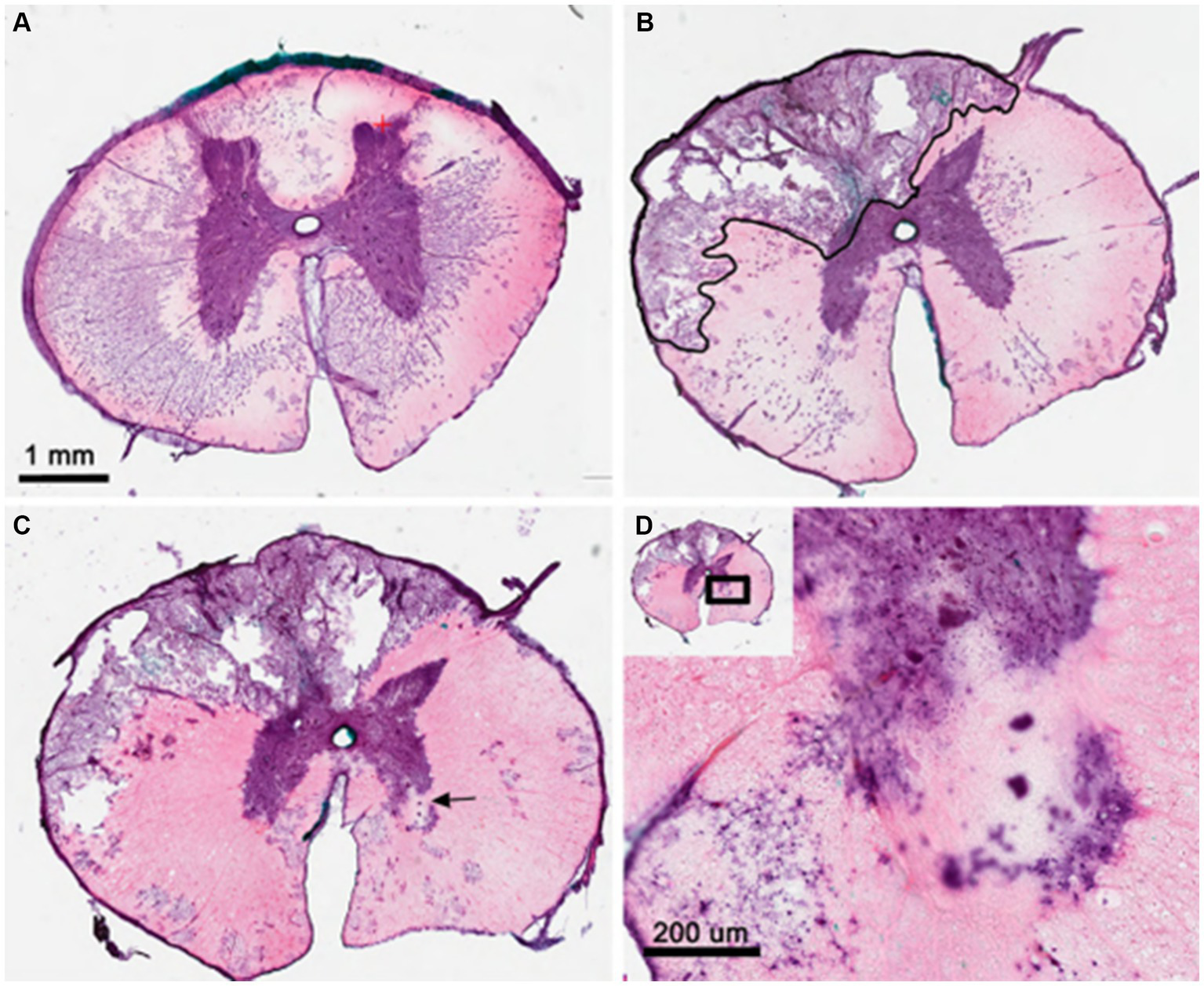 Histologic analysis of dorsolateral compression injury of the thoracic spinal cord from pig #4. (A) H&E staining of T10 spinal segment showing normal thoracic gray and white matter structures. (B) T12 segment at site of balloon compression shows cystic cavitation in the dorsolateral white matter and ipsilateral dorsal horn. Black outline indicates early cavitation perimeter with sparse axonal sparing and inflammation. (C) 100 mm caudal to lesion epicenter showing multi-lobular nature of cystic cavity and evidence of contralateral gray matter stroke (arrow). (D) High magnification of contralateral ventral horn showing evidence of both ventral horn motor loss and scarring as well as neighboring white matter damage. H&E, hematoxylin and eosin; mm, millimeters.