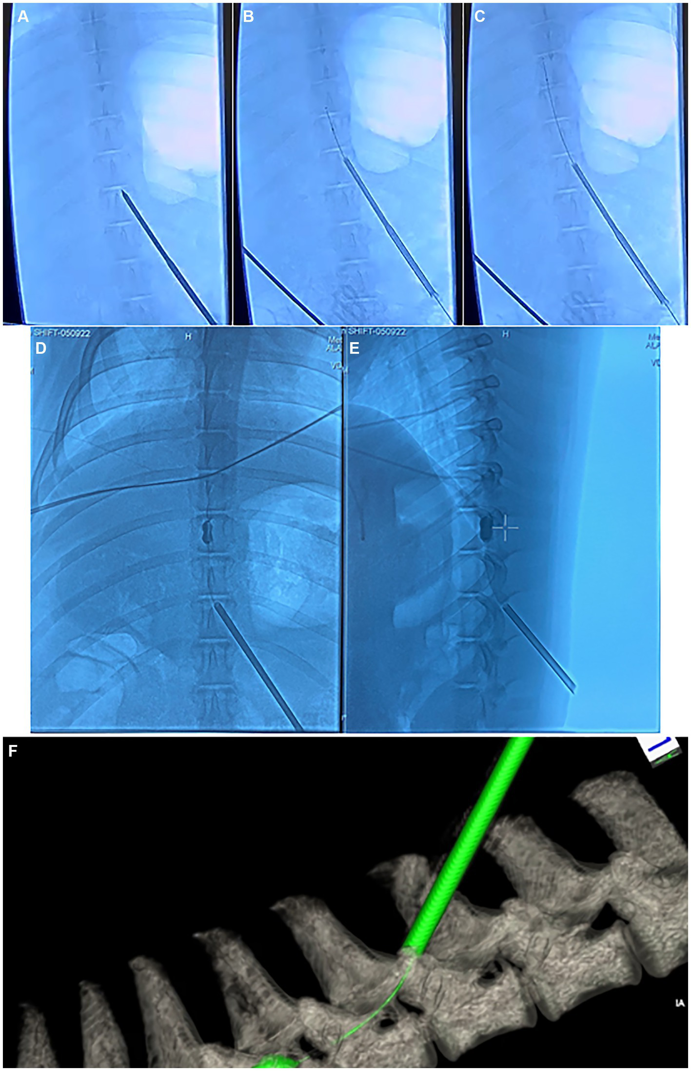 Fluoroscopy and computed tomography (CT) images depicting the injury surgery. (A–C) anterior–posterior (AP) fluoroscopy images depicting the insertion of the Jamshidi needle into the interlaminar epidural space in the thoracic spine, along with deployment of the kyphoplasty cannula into the epidural space. (D) AP and (E) lateral fluoroscopy images depicting inflation of the kyphoplasty balloon within the epidural space. (F) Dyna-CT depicting the kyphoplasty catheter and inflated balloon within the epidural space.
