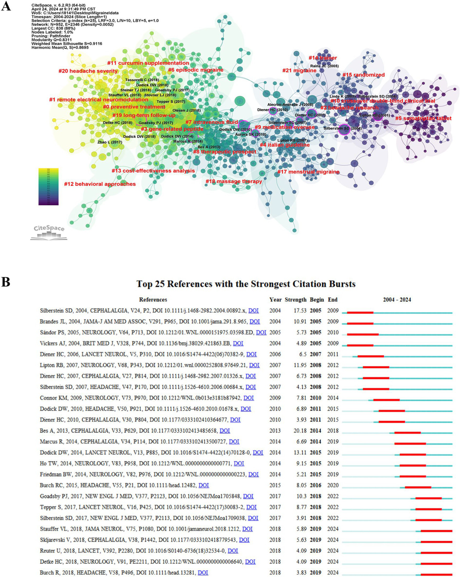 Table 3 presents the top 10 most cited articles related to migraine clinical trials. The article titled “Headache Classification Committee of the International Headache Society (IHS) The International Classification of Headache Disorders, 3rd edition,” published in Cephalalgia in 2018, was the most referenced, with 142 citations. This paper provides a comprehensive classification and identification of migraine, offering a standardized foundation for subject selection in clinical trials (4). Two papers co-cited by another literature were reported to have a co-citation relationship. Co-citation cluster analysis objectively delineates the knowledge structure of a research domain, pinpointing seminal publications, foundational information, and emerging research horizons within the field. To further delineate the clusters of co-cited references, we employed the clustering feature in CiteSpace, utilizing the LLR method to extract nominal terms from the cited works’ titles, generating a network diagram (Figure 5A). The network has a high Q-value (Q = 0.8311) and (S = 0.9116), signifying it is a well-structured and highly credible clustering model. Dodick DW’s article “OnabotulinumatoxinA for treatment of chronic migration: pooled results from the double blind, randomized, placebo-controlled phases of the PREEMPT clinical program,” published in the journal Headache in 2010, demonstrates high centrality (13). It explores the preventive treatment of chronic migraine and suggests the efficacy of onabotulinum toxin A in reducing headache frequency and related disabilities, challenging the previous exclusion of chronic migraine patients from migraine prevention trials due to perceived disability and treatment resistance (14, 15). The network comprises 21 clusters, with the largest cluster (#0 preventive treatment) consisting of 108 members and a silhouette value of 0.862. The initial clusters were #5 sumatriptan tablets, #10 crossover double-blind clinical trials, and #2 headache research. Subsequent research progressed to the #9 medication overuse, #8 therapeutic prospects, and #7 intravenous fluid. In recent years, the connections between clusters have strengthened, particularly in areas such as #3 gene-related peptide, #0 preventive treatment, #1 remote electrical neuromodulation, #11 curcumin supplementation, and #20 headache severity. Figure 5B illustrates the top 25 references with the most significant citation bursts. The earliest four citation bursts began in 2005, whereas the most intense burst (20.18) occurred with BesA’s publication (16) in Cephalalgia in 2013, spanning from 2014 to 2018. The five most recent citation bursts occurred from 2019 to the present, with the highest burst (5.89) associated with Stauffer VL’s article “Evaluation of Galcanezumab for the Prevention of Episodic Migraine” (17), published in JAMA Neurol in 2018.