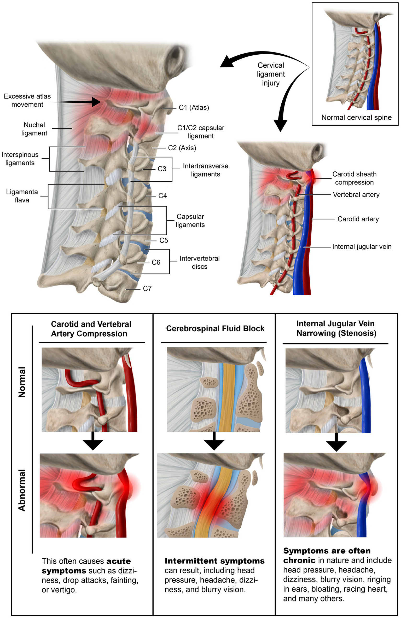 Ligamentous cervical instability is a progressive disorder causing a normal lordotic curve to break down, ultimately leading to an “S” or “sigmoid” curve and potentially compressing the structures in the carotid sheath, including the vagus nerves and internal jugular veins.