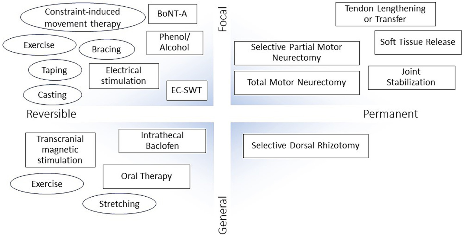 Treatment selection depends on understanding the role and application of each method in relation to the individual needs of the patient. In general, there a four categories of treatment approach, covering localized and reversible methods (e.g., BoNT-A, EC-SWT, and casting), focal and permanent surgical intervention, general and reversible pharmacologic therapy (e.g., intrathecal baclofen), and general and permanent selective dorsal rhizotomy (Figure 2) (10).