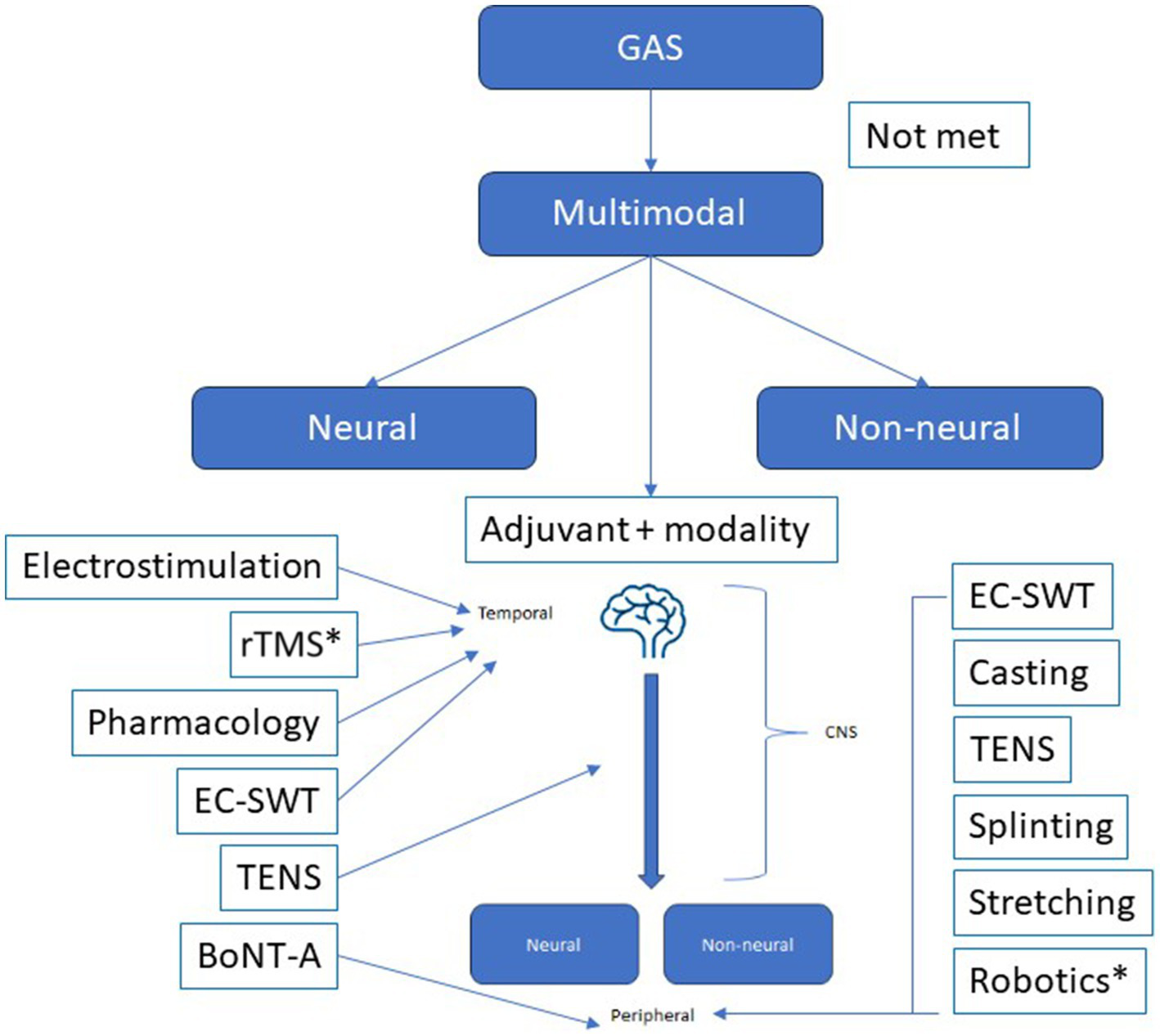 Multimodal therapy can target both neural and non-neural pathways, as well as help with soft tissue rearrangements and decrease muscle overactivity. BoNT-A can be part of the multimodal therapy and as an adjunct to other treatments (such as casting, electrical stimulation, splinting, physiotherapy), or treatments such as casting, electrical stimulation, splinting, physiotherapy can be an adjunct to BoNT-A injections. *Consensus on utility not obtained from the TOXNET group. GAS, goal attainment scale; EC-SWT, ExtraCorporeal Shock Wave Therapy; TENS, transcutaneous electrical nerve stimulation; rTMS, repetitive transcranial magnetic stimulation.