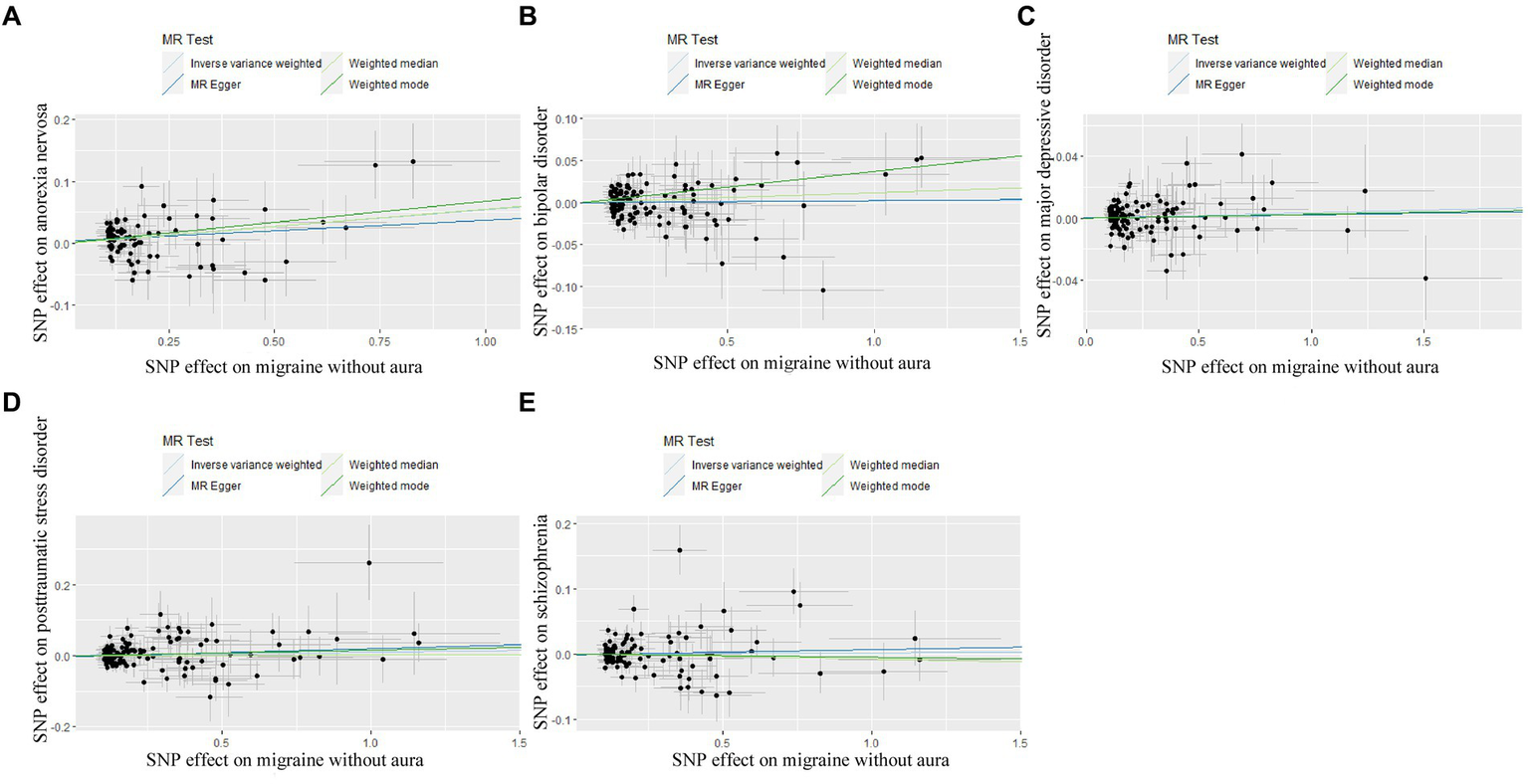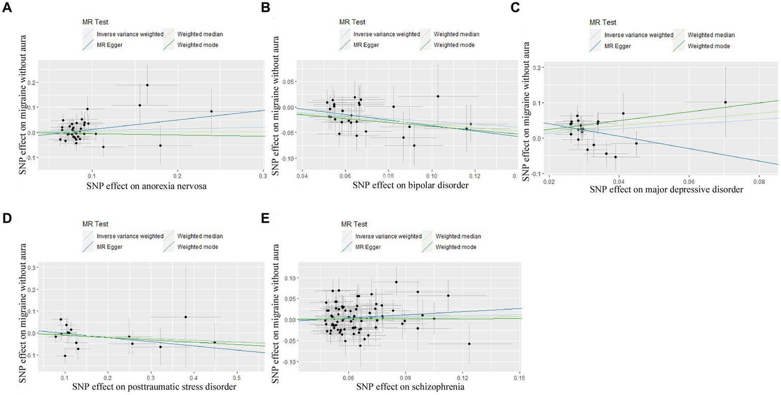 Scatter plot of genetic correlation for psychiatric disorders on migraine without aura by different MR analysis methods. (A) The causal effect of anorexia nervosa on migraine without aura; (B) The causal effect of bipolar disorder on migraine without aura; (C) The causal effect of major depressive disorder on migraine without aura; (D) The causal effect of posttraumatic stress disorder on migraine without aura; (E) The causal effect of schizophrenia on migraine without aura.