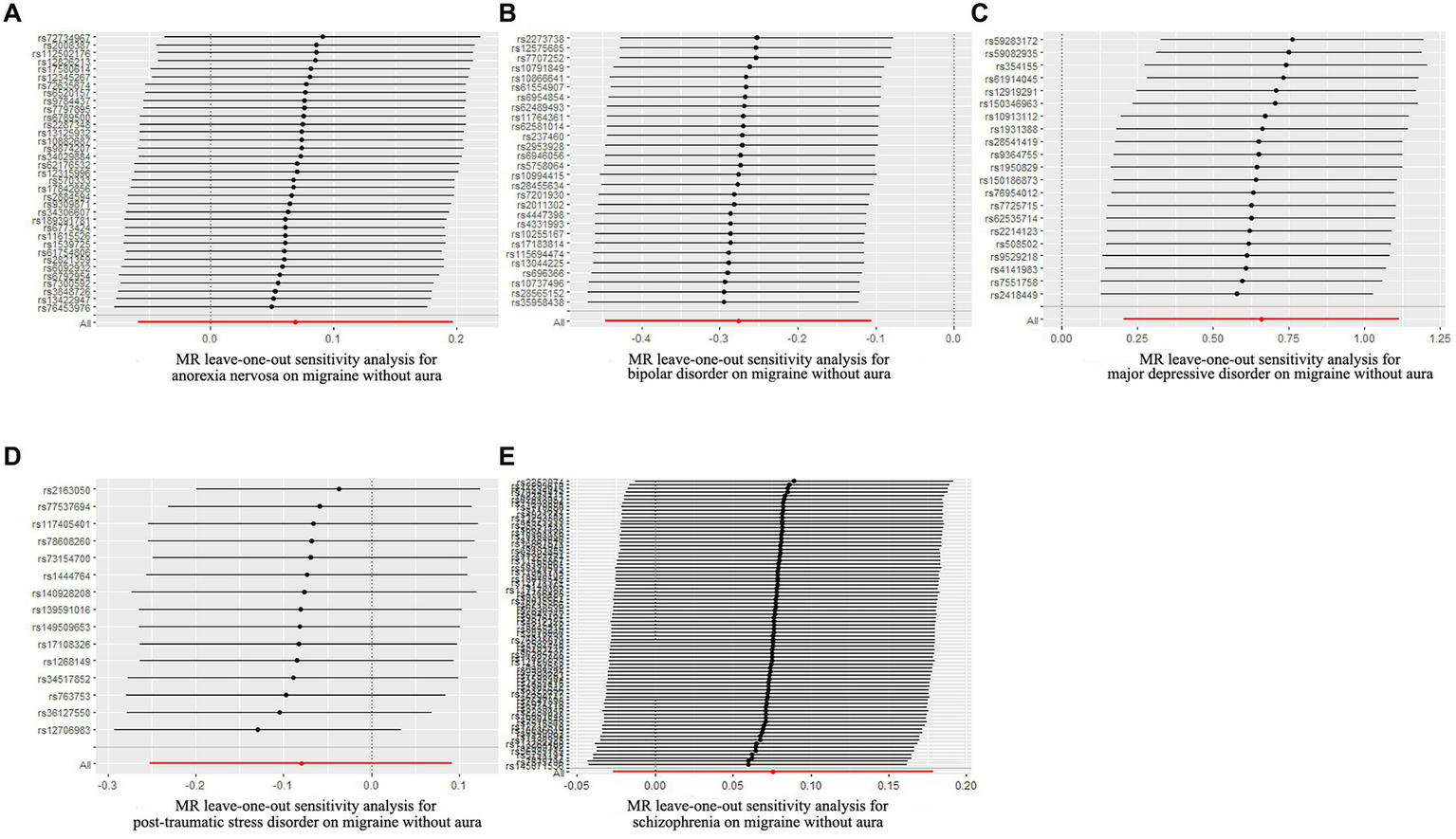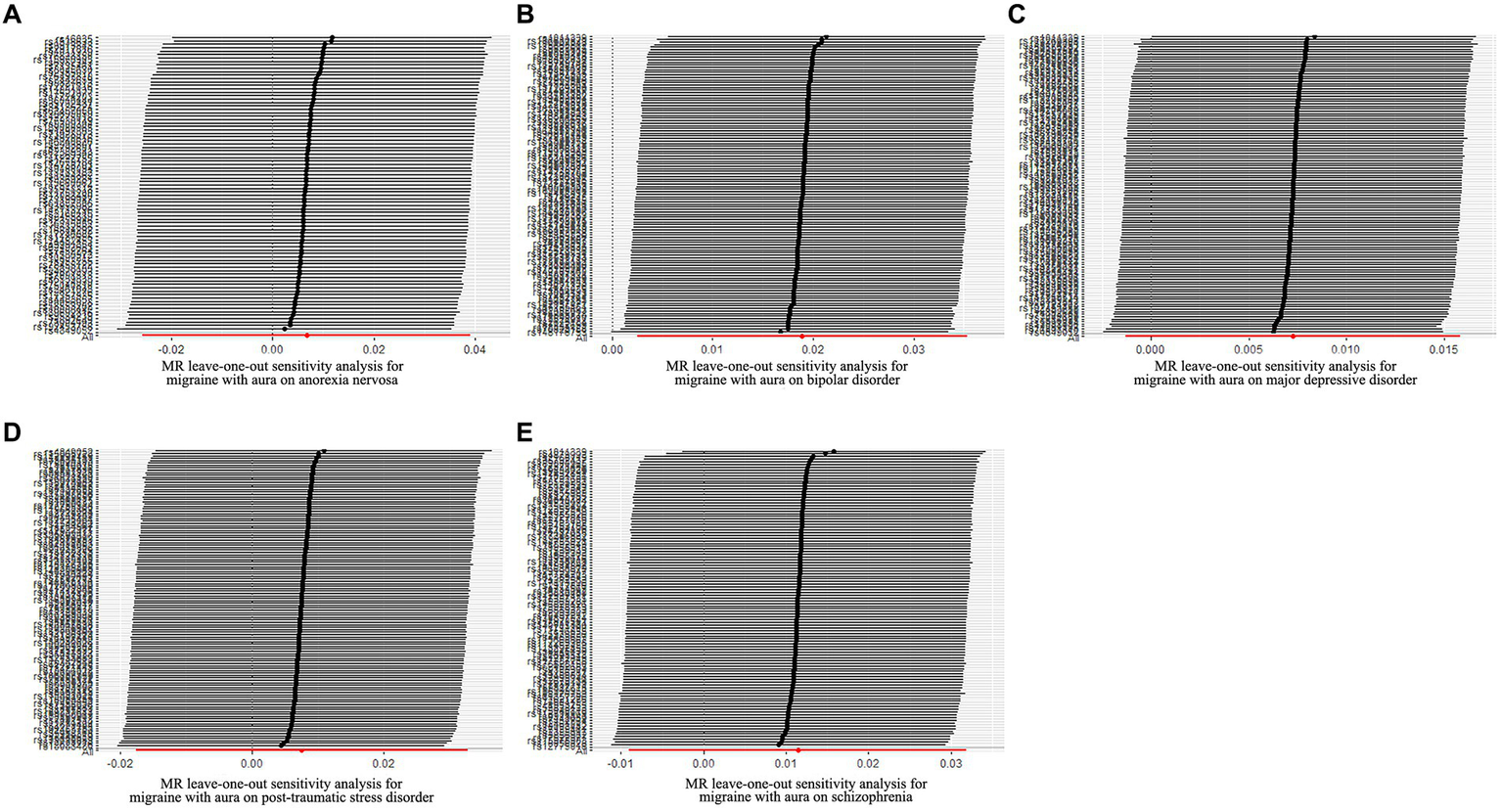Leave-one-out sensitivity analysis for psychiatric disorders on migraine with aura. (A) The sensitivity analysis for anorexia nervosa on migraine with aura; (B) The sensitivity analysis for bipolar disorder on migraine with aura; (C) The sensitivity analysis for major depressive disorder on migraine with aura; (D) The sensitivity analysis for posttraumatic stress disorder on migraine with aura; (E) The sensitivity analysis for schizophrenia on migraine with aura.