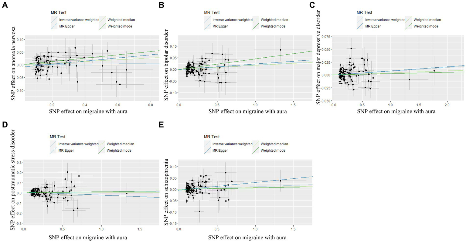 Scatter plot of genetic correlation for psychiatric disorders on migraine with aura by different MR analysis methods. (A) The causal effect of anorexia nervosa on migraine with aura; (B) The causal effect of bipolar disorder on migraine with aura; (C) The causal effect of major depressive disorder on migraine with aura; (D) The causal effect of posttraumatic stress disorder on migraine with aura; (E) The causal effect of schizophrenia on migraine with aura.