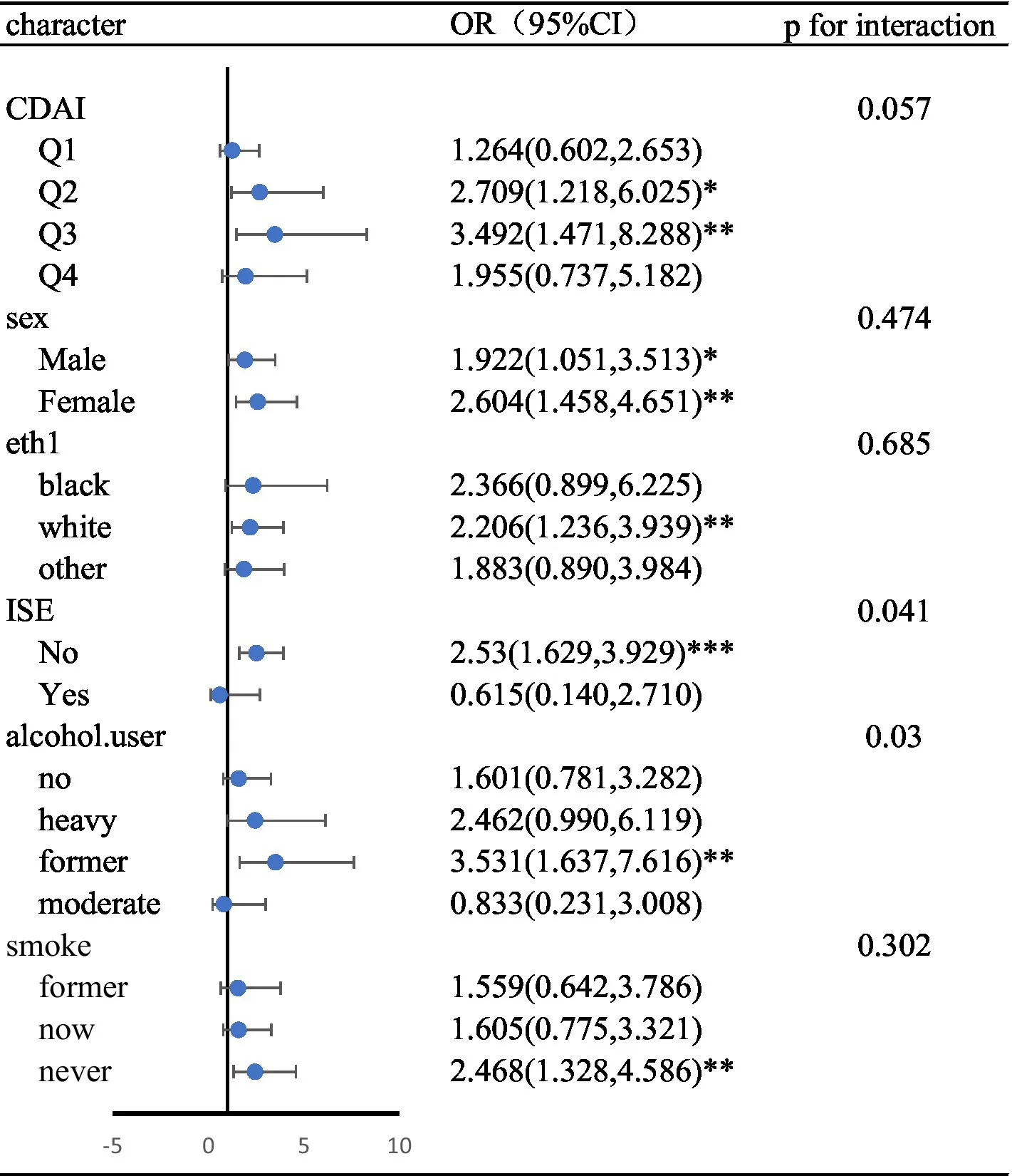 Binary logistic regression analysis of the relationship between meantal illness and CDAI.