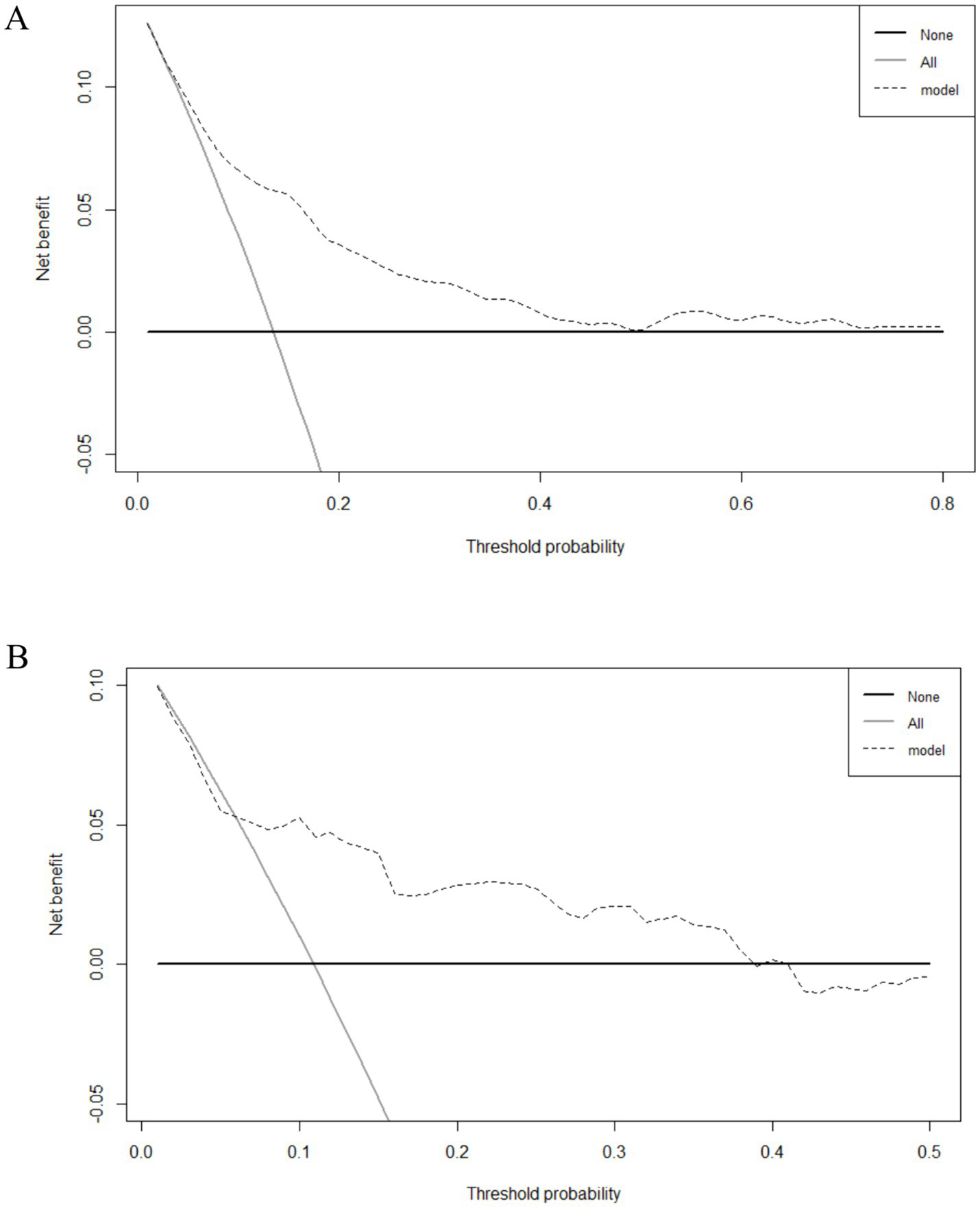 Discrimination, calibration, and clinical practicality were used to evaluate the nomogram. Receiver operating characteristics (ROC) curves were drawn using the’ rms’ package, and the area under the curve (AUC) values were measured to estimate the discrimination. In general, AUC values of 0.50 represent no discrimination, 0.50–0.70 represent poor discrimination, 0.70–0.80 represent reasonable discrimination, and > 0.80 represent good discrimination (22). Calibration curves were drawn, and the Hosmer–Lemeshow test was conducted to estimate the calibration; a p value >0.05 indicated excellent calibration (23). Decision curve analysis (DCA) was conducted graphically to evaluate the clinical practicability.