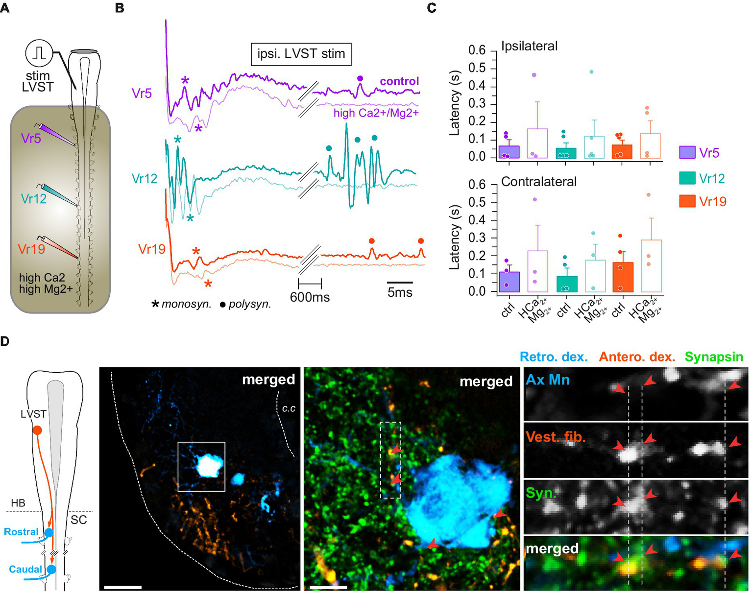 LVST inputs on spinal motoneurons. (A) Schematic of the semi-intact preparation used to record spinal ventral root responses to electrical stimulation of the LVST nucleus. (B) Trace examples of LVST-evoked motor response in rostral (Vr5, purple), medial (Vr12, turquoise) and caudal (Vr19, orange) ventral roots before and during bath application of Ca2+/Mg2+-enriched saline restricted to the spinal cord. Monosynaptic (monosyn.) events are labeled with an asterisk and polysynaptic (polysyn.) events are labeled with a dot. (C) Averaged (mean ± SD) motor response latencies in ipsi- (top) and contralateral (bottom) rostral, medial and caudal Vr evoked by LVST electrical stimulation before and during Ca2+/Mg2+-enriched saline application. (D) Leftmost panel: CNS scheme depicting retrograde (Retro. Dex) labeling of rostral and caudal spinal motoneurons together with anterograde (Antero. dex.) labeling from the LVST. Left picture: confocal stack orthogonal projection of a spinal cross-section showing a retrogradely labeled caudal motoneuron and vestibulospinal terminals anterogradely labeled from the ipsilateral LVST. Middle picture: magnification (×40) of the square area drawn on the left picture with synapsin immunofluorescence labeling. Right picture column: confocal magnification (×60) of the rectangle dashed area drawn on middle picture illustrating, from top to bottom, axial motoneurons dendrites (Ax Mn), vestibulospinal fibers (Vest. Fib.), synapsin (syn.) immunofluorescence, and merge. Fluorescence signal close appositions are pointed with red arrowheads. Scale bars in left and middle pictures are 50 μm and 10 μm, respectively. c.c., central canal; HB, hindbrain; SC, spinal cord.