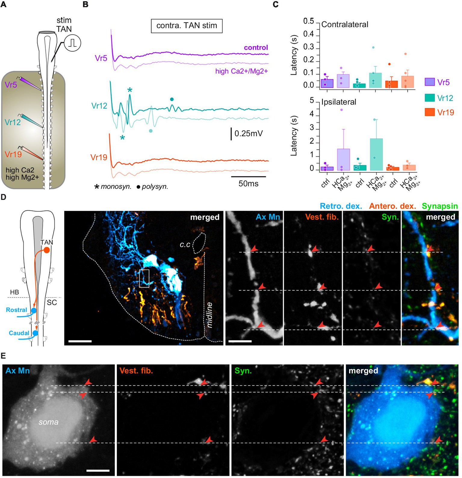 TAN inputs on spinal motoneurons. (A) Schematic of the semi-intact preparation used to record spinal ventral root responses to electrical stimulation of the TAN nucleus. (B) Trace examples of TAN-evoked motor responses in rostral (Vr5, purple), medial (Vr12, turquoise) and caudal (Vr19, orange) ventral roots before and during bath application of Ca2+/Mg2+-enriched saline restricted to the spinal cord. Monosynaptic (monosyn.) events are labeled with an asterisk and polysynaptic (polysyn.) events are labeled with a dot. (C) Averaged (mean ± SD) motor response latencies in contra- (top) and ipsilateral (bottom) rostral, medial and caudal Vr evoked by TAN electrical stimulation before and during Ca2+/Mg2+-enriched saline application. (D) Leftmost panel: CNS scheme depicting retrograde (Retro. Dex) labeling of rostral and caudal spinal motoneurons together with anterograde (Antero. dex.) labeling from the TAN. Left picture: confocal stack orthogonal projection of a spinal cross-section showing a retrogradely labeled caudal motoneuron and vestibulospinal terminals anterogradely labeled from the contralateral TAN. Right picture series: confocal magnification (×60) of the rectangle area drawn on the left picture illustrating, from left to right, axial motoneurons dendrites (Ax Mn), vestibulospinal fibers (Vest. Fib.), synapsin (syn.) immunofluorescence, and merge. Close signal appositions are pointed with red arrowheads. Scale bars in left picture and magnification are 100 μm and 10 μm, respectively. (E) Confocal magnification (×60) of an axial motoneuron soma (Ax Mn), vestibulospinal fibers (Vest. fib.), synapsin (Syn.) immunofluorescence, and merge. Close signal appositions are pointed with red arrowheads. Scale bar is 100 μm. c.c., central canal; HB, hindbrain; SC, spinal cord.