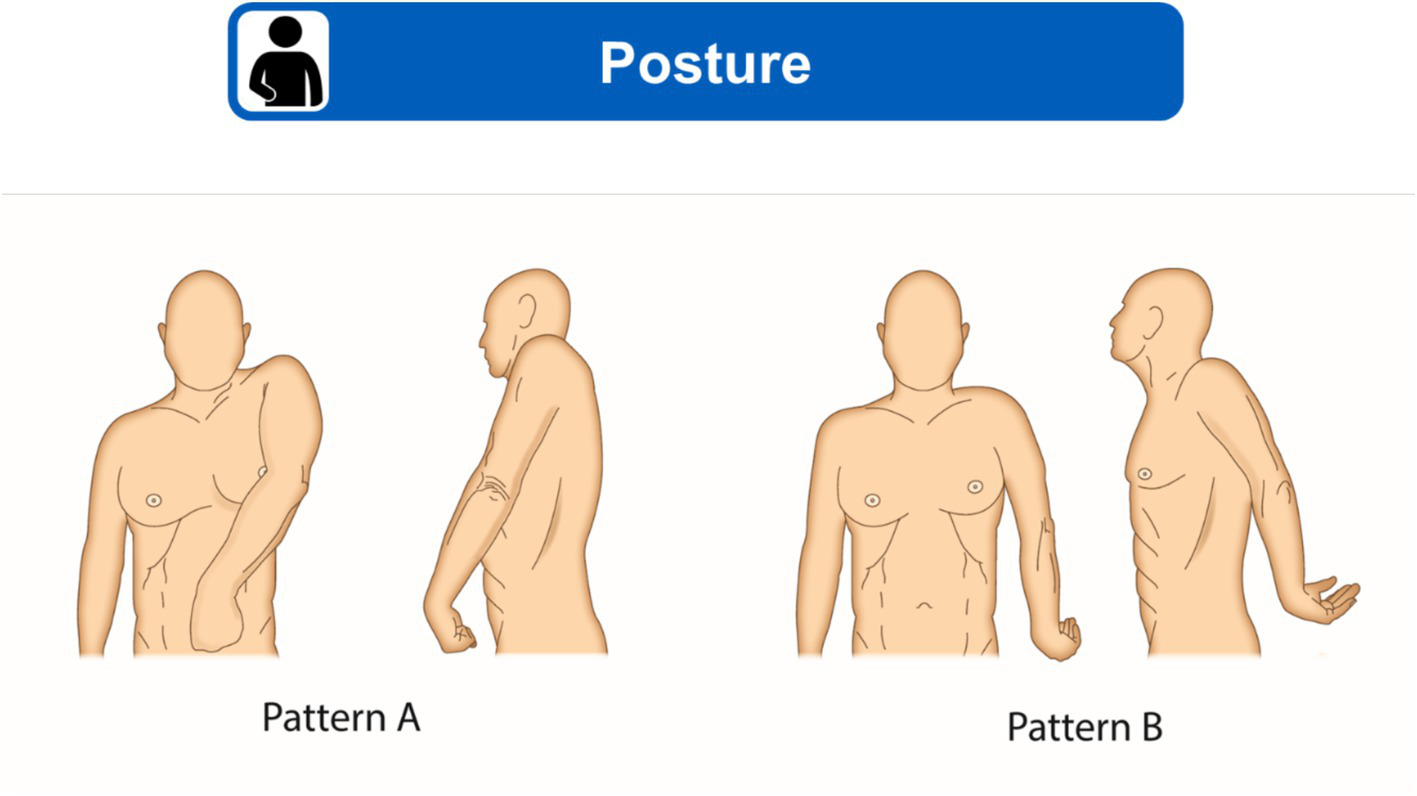 Posture should be observed when sitting and, if the person is able to, when walking, or standing/assisted standing position. Posture can be compared with published patterns of shoulder spasticity; for example, the two shoulder-specific patterns reported by Jacinto et al. (22) and reproduced in Figure 2, which are the most common patterns encountered in clinical practice.