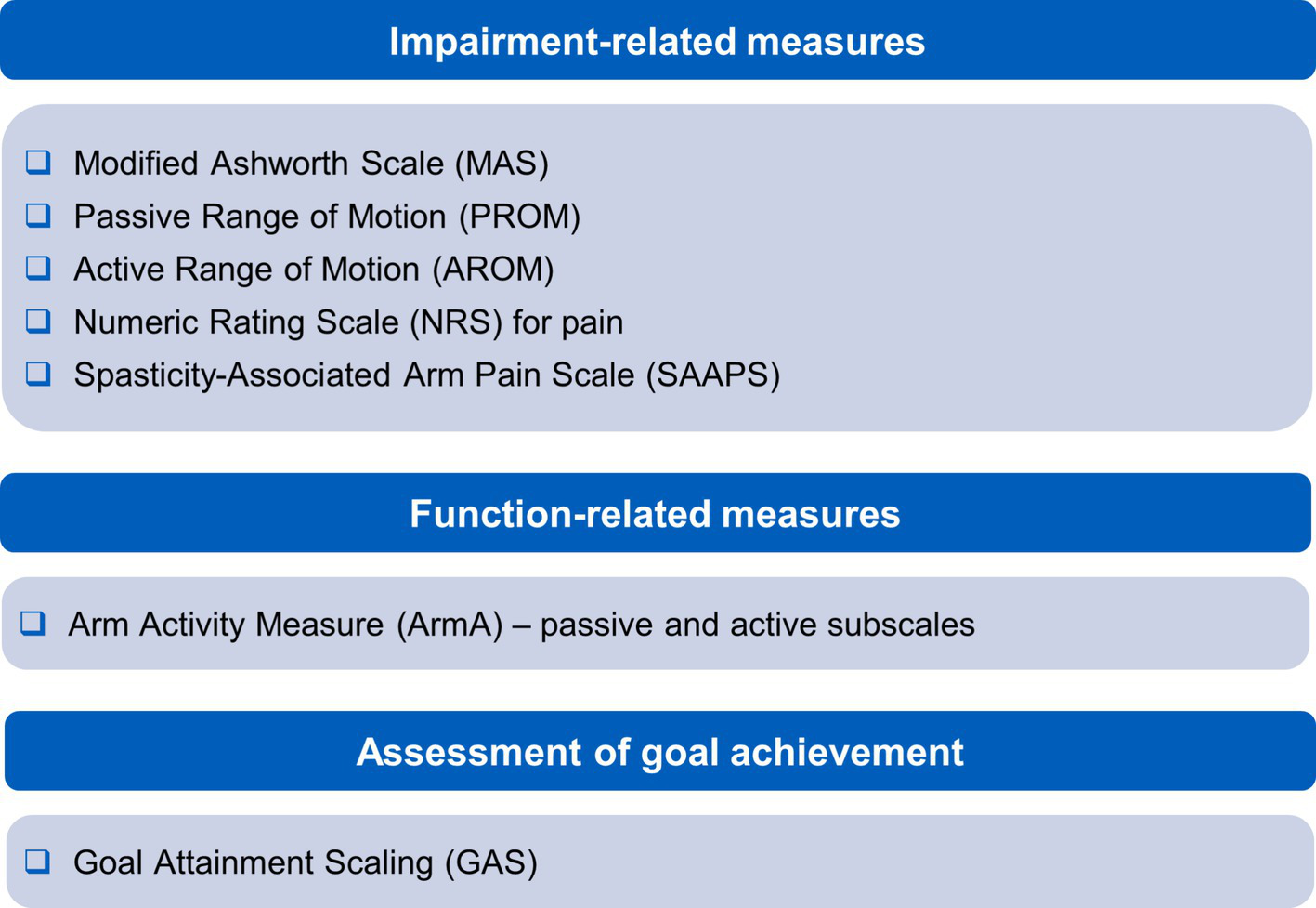 Impairment-related measurements include the Modified Ashworth Scale (MAS) (31), passive and active range of motion assessments, and a numeric graphic rating scale for pain (3). Items measured may overlap with goals identified for scoring with GAS, allowing efficiency in clinic. Measuring function with the Arm Activity Measure (ArmA) (32) is particularly useful in this regard as it has the advantage of covering passive and active function, is suitable for use in spasticity and can be scored by the patient or their carers. An additional measure the authors find useful for monitoring response of pain to treatment is the Spasticity-Associated Arm Pain Scale. This records pain with shoulder abduction and external rotation, elbow, wrist and finger movements (27). It has the advantage of being quick to apply and can be used for people without verbal communication.