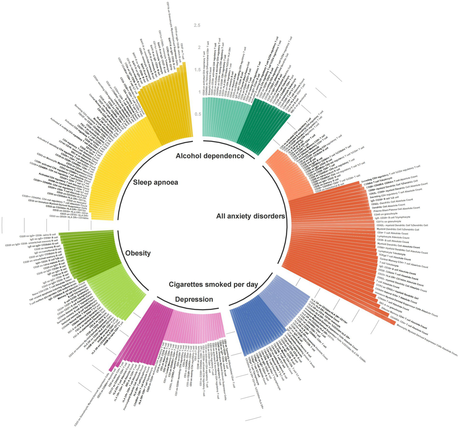 With regard to immune cells, alcohol dependence, cigarettes smoked per day, depression, all anxiety disorders, sleep apnoea, and obesity were, respectively, associated with 33, 31, 38, 62, 69, and 39 types of immune cells, respectively. In the heterogeneity and pleiotropy analyses, both p-values exceeded the significance threshold of 0.05. Among the immune cells related to cigarettes smoked per day, CD33- HLA DR+ Absolute Count highly supported the colocalization analysis (PH4 = 0.814), while HLA DR on CD33dim HLA DR+ CD11b + (PH4 = 0.696) and HVEM on naive CD4+ T cell (PH4 = 0.532) moderately supported the colocalization analysis in relation to obesity (Supplementary Table S5).