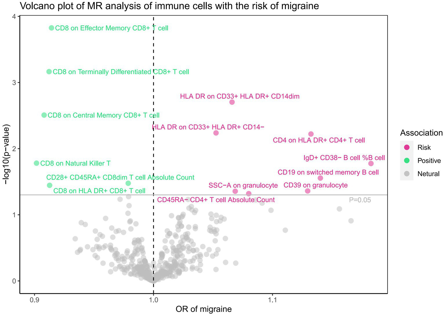 Our study has limitations. Firstly, our mediated MR results did not find a clear mediated effect between inflammatory proteins and immune cells in the relationship between migraine risk factors and migraine itself. This could be attributed to the limited explanatory power of genetic variations, and the intricate interactions among the three factors. Future research utilizing diverse methodologies and larger sample sizes is required to further delve into this complex relationship (14). Secondly, we primarily relay on several large-scale GWAS datasets, yet the lack of detailed demographic information hinders in-depth subgroup analyses. Thirdly, migraine varies significantly in attack frequency and disability, affecting patients differently. It can be classified as acute or chronic, but in this study, we focus specifically on acute migraine attacks, excluding chronic migraine. Furthermore, due to the inherent limitations of the MR method, our exploration of the relationships among migraine risk factors, migraine, inflammatory proteins, and immune cells is solely genetic, whereas the actual conditions are determined by a combination of environmental and genetic factors. Future studies, using different methodologies and larger sample sizes, may be able to shed more light on this complex relationship.