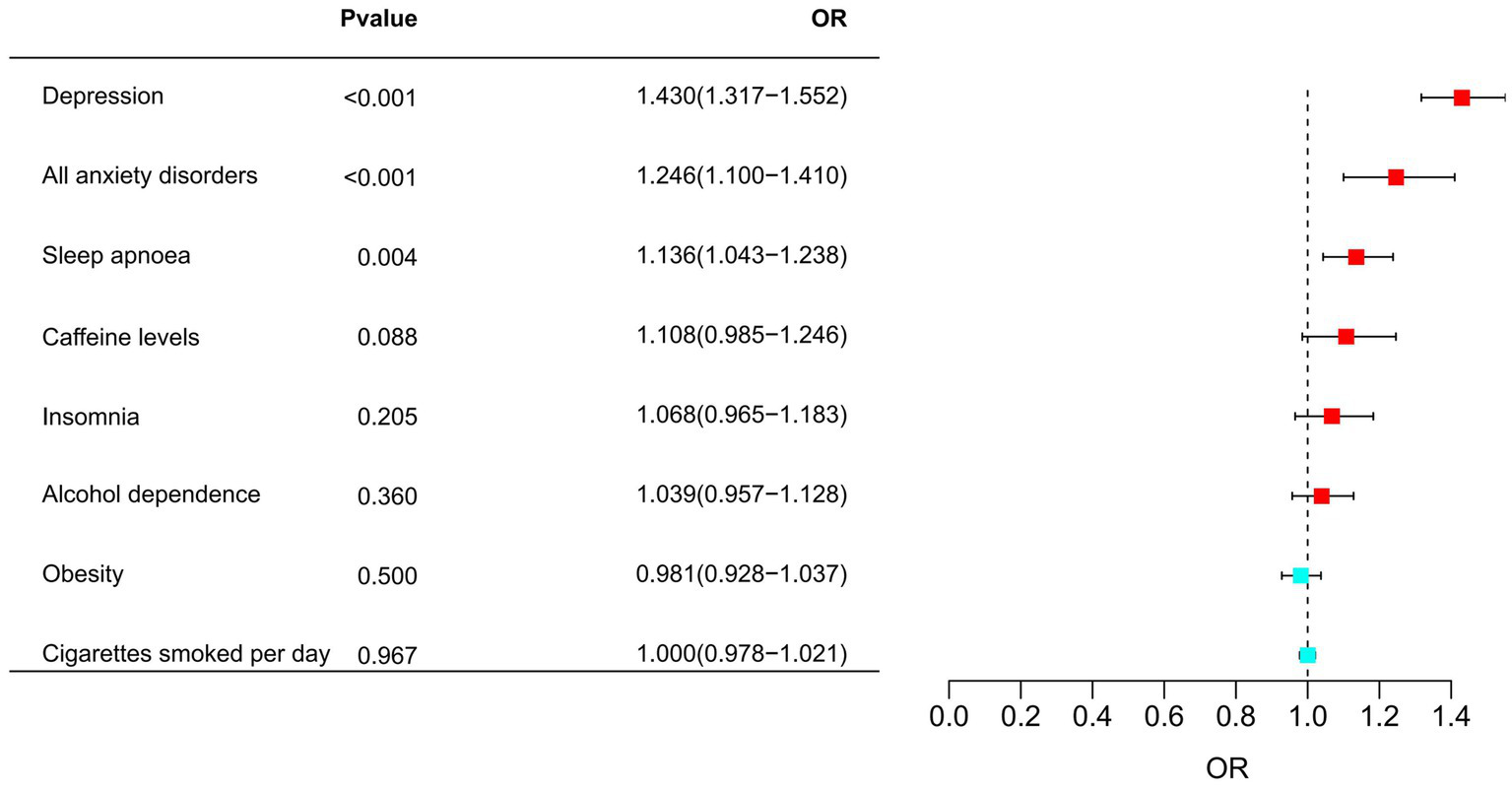 Understanding the association between migraine risk factors and inflammatory responses is crucial for elucidating migraine pathophysiology. While common risk factors like depression or anxiety (25), insomnia (26) and obesity (27, 28) have been implicated in modulating immune function and promoting inflammation. Epidemiological research has revealed a reciprocal association between migraines and these risk factors, wherein individuals with one condition are at an increased risk of developing the other (17, 29). This correlation is thought to stem from common genetic influences, disturbances in neurotransmitter function, inflammation, hormonal changes, and concurrent conditions present in both disorders (6). The precise mechanistic interactions remain subject to ongoing investigation. In the pursuit of clarifying the causative relationships between migraine risk factors and inflammatory responses, methodologies such as Mendelian randomization (MR) offer promising avenues (30). By leveraging genetic variations associated with exposure factors as instrumental variables, MR enables the exploration of causal associations while minimizing confounding effects (31).