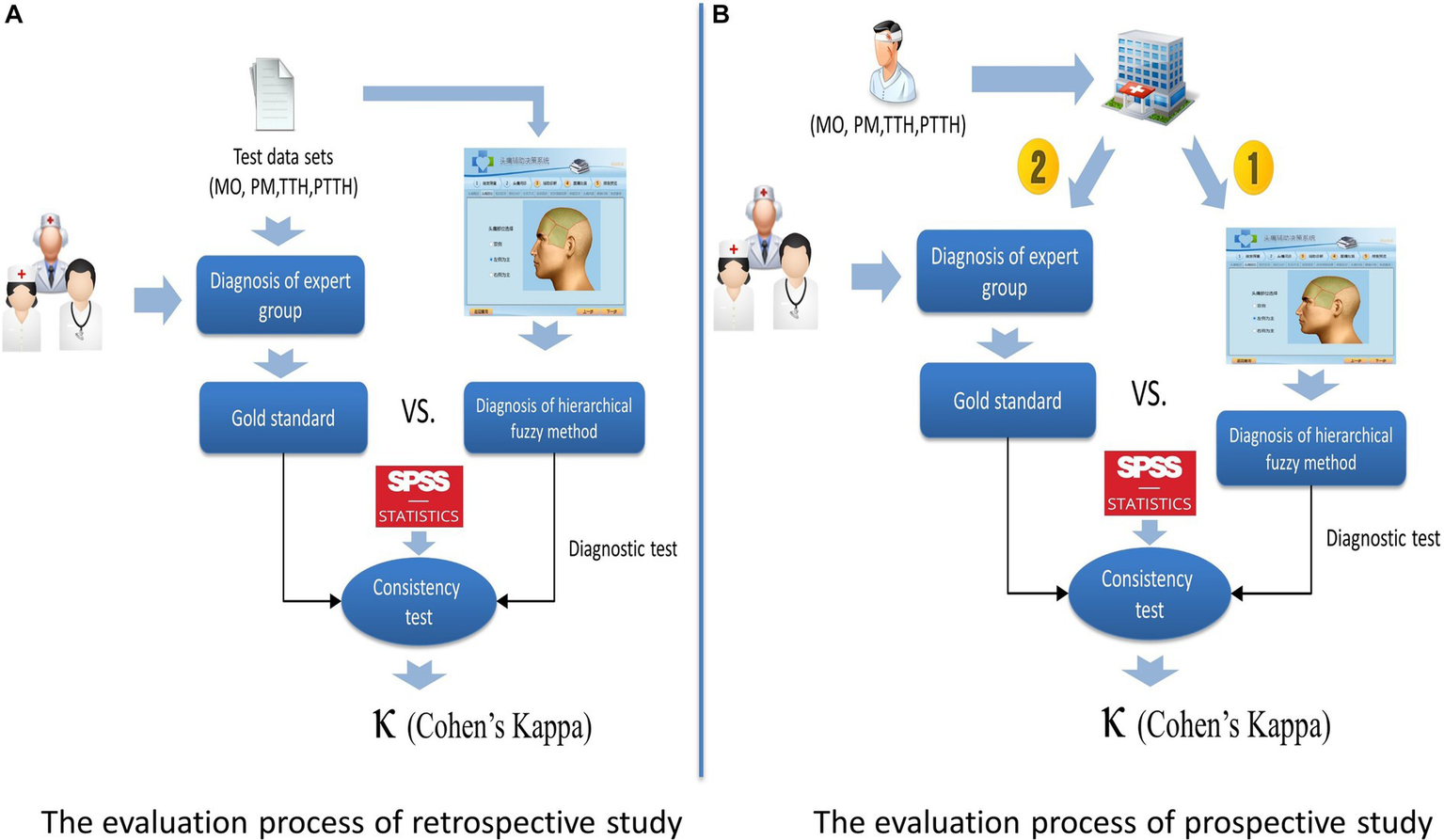 To evaluate the validity of the presented method, a retrospective study and a prospective study were designed and conducted in Chinese PLA General Hospital respectively. For the retrospective study, the process of evaluation was as follows: first, the diagnosis in each case was reconfirmed by three headache experts and the diagnosis of the expert group was regarded as the gold standard; then, the fuzzy-based CDSS made diagnosis according to the clinical symptoms of each case input by a neurologist who did not know the experts’ diagnosis. For the prospective study, the fuzzy-based CDSS was applied in a real clinical environment. The process of evaluation was as follows: when a patient came to the headache clinic, his/her clinical symptoms were input into the CDSS after an in-depth clinical interview was conducted with a neurologist, and a diagnosis conclusion was made by the CDSS; then the patient would enter into the three headache experts’ offices, and independent diagnoses was made by the three experts respectively. The final decision of the expert group was by a simple majority. The diagnostic procedures of the headache expert group and the fuzzy-based CDSS were independent and completed on the same day. The process of retrospective study and prospective study are shown in Figure 5.