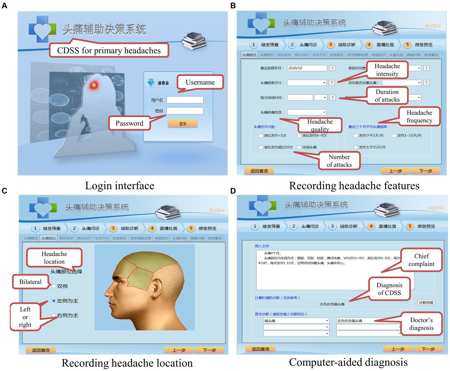 The main functions of the CDSS in this paper are shown in Figure 6. The CDSS is available at the website and can be visited with a web browser on desktop computers and mobile devices. Figure 6A shows the login interface; every doctor authorized to use the system is assigned a username and a password. Figure 6B shows the user interface for recording the patient’s headache features. All the input items of the system interface come from the ICHD-3, and they include all the necessary information for diagnosis. The doctor can interview a patient according to the tips in the GUI, which can help to save much time and prevent the doctor from missing critical information. Figure 6C shows the user interface for recording the headache location. After the previous step, the CDSS can make a diagnosis by fuzzy logic, as shown in Figure 6D. The doctor needs to decide whether to accept the diagnosis of the CDSS. If not, the doctor needs to input a different diagnosis into the CDSS. The doctor can click on the “Diagnostic criteria” button if it is not clear why the CDSS has made a certain diagnosis, and the CDSS will display the latest diagnostic criteria to help the doctor better understand the ICHD-3.