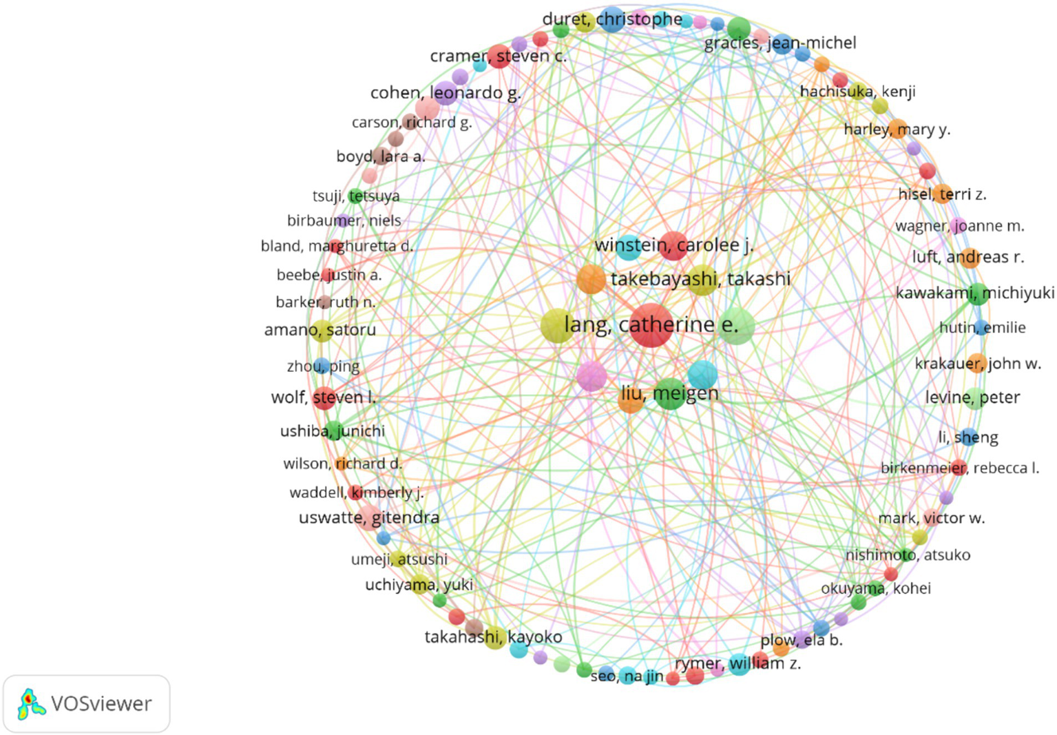 Network of authors engaged in post-stroke upper limb dysfunction. Nodes represent authors (the larger the circle, the greater the number of publications). The lines between nodes represent the cooperation between two authors of the same article (the wider the line, the more frequent the cooperation).