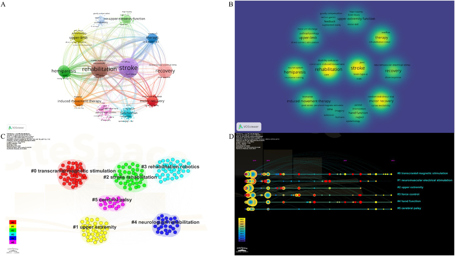 Bibliometrics is an interdisciplinary field that utilizes statistical and quantitative methods to study, evaluate, and analyze scientific literature. It serves to review the current state of specific research areas, identify hotspots, discern trends, and assess the quality of publications. Among the databases used for such analyses, the Web of Science Core Collection (WoSCC) stands out as the predominant choice (21). The application of information visualization technology and methods can intuitively show the development process, research status, research hotspots and development trends of the research field, and help to identify the current development status and emerging research directions (22). However, from the perspective of bibliometrics, the comprehensive knowledge structure, evolutionary pathways and research hotspots in the field of post-stroke upper limb disorders have not been analyzed. Bibliometric articles related to upper limb dysfunction after stroke have not yet been published.